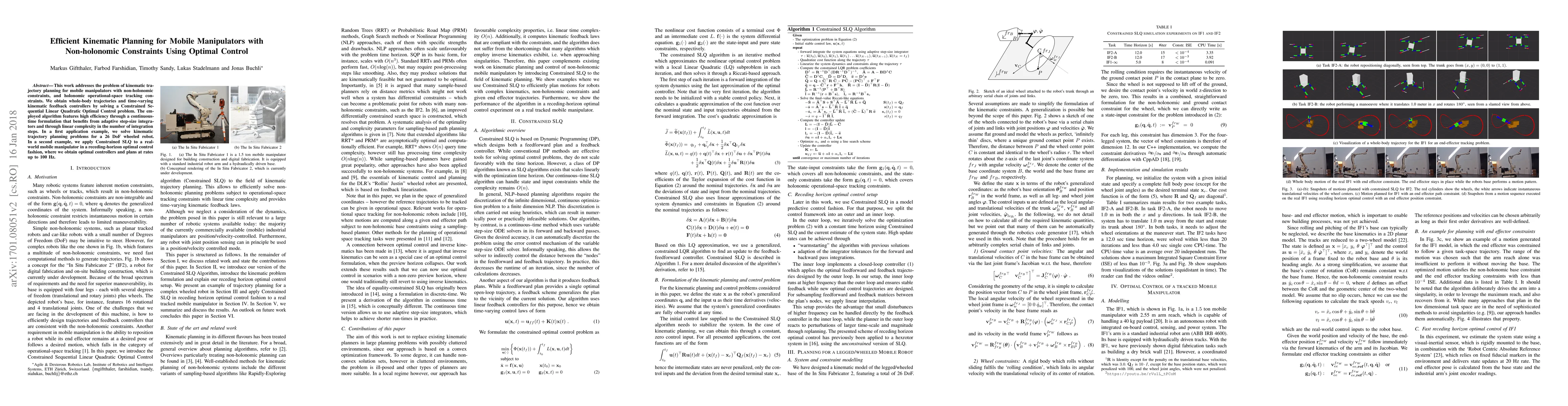 This work addresses the problem of kinematic trajectory planning for mobile manipulators with non-holonomic constraints, and holonomic operational-space tracking constraints. We obtain whole-body trajectories and time-varying kinematic feedback controllers by solving a Constrained Sequential Linear Quadratic Optimal Control problem. The employed algorithm features high efficiency through a continuous-time formulation that benefits from adaptive step-size integrators and through linear complexity in the number of integration steps. In a first application example, we solve kinematic trajectory planning problems for a 26 DoF wheeled robot. In a second example, we apply Constrained SLQ to a real-world mobile manipulator in a receding-horizon optimal control fashion, where we obtain optimal controllers and plans at rates up to 100 Hz.