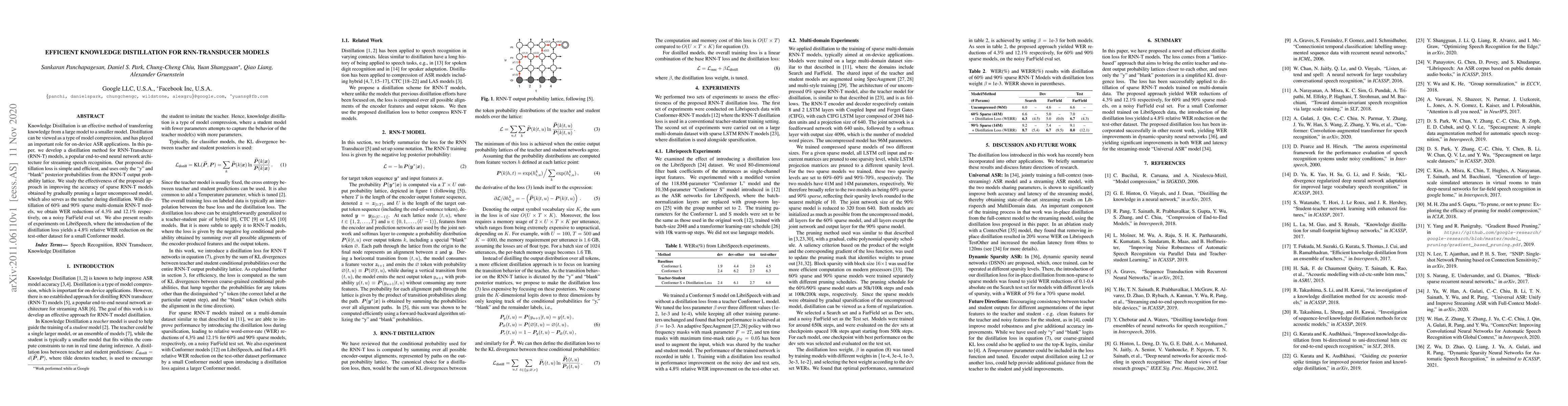 This paper proposes an efficient knowledge distillation method for RNN-Transducer models used in speech recognition, achieving significant Word Error Rate (WER) reductions by transferring knowledge from larger models to smaller, pruned versions. The distillation loss focuses on "y" and "blank" probabilities from the RNN-T output, resulting in notable improvements on both noisy and clean datasets.