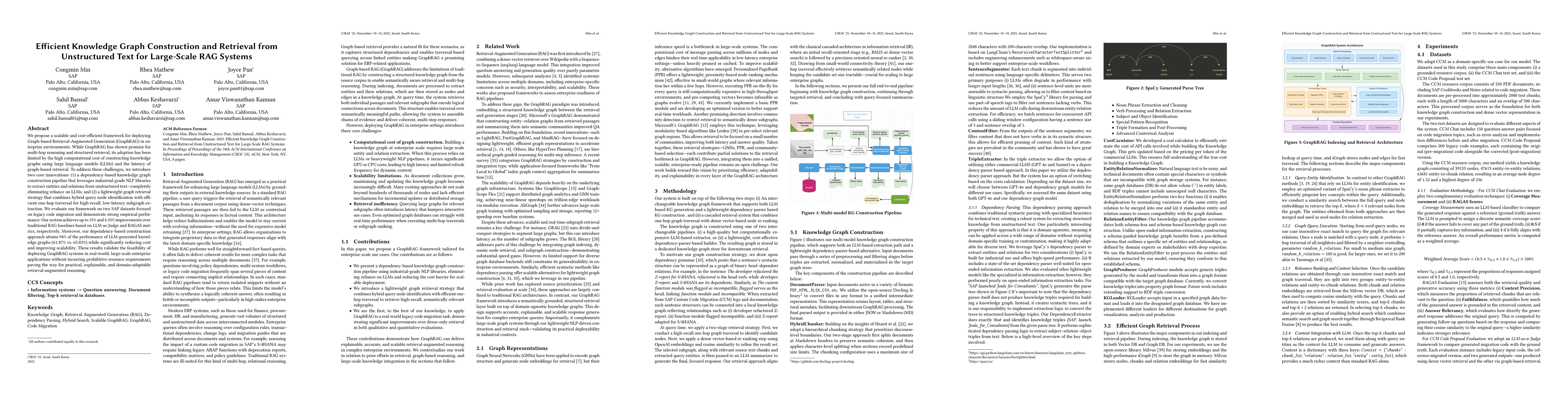 This research presents a scalable, cost-efficient framework for implementing Graph-based Retrieval Augmented Generation (GraphRAG) in enterprise settings. It introduces a dependency-based knowledge graph construction method using industrial-grade NLP libraries, eliminating the need for large language models. The framework also includes a lightweight graph retrieval strategy for high-recall, low-latency subgraph extraction. Evaluation on SAP datasets shows up to 15% and 4.35% performance improvements over traditional RAG baselines, with 94% of LLM-generated knowledge graphs' performance but significantly reduced costs and improved scalability.
