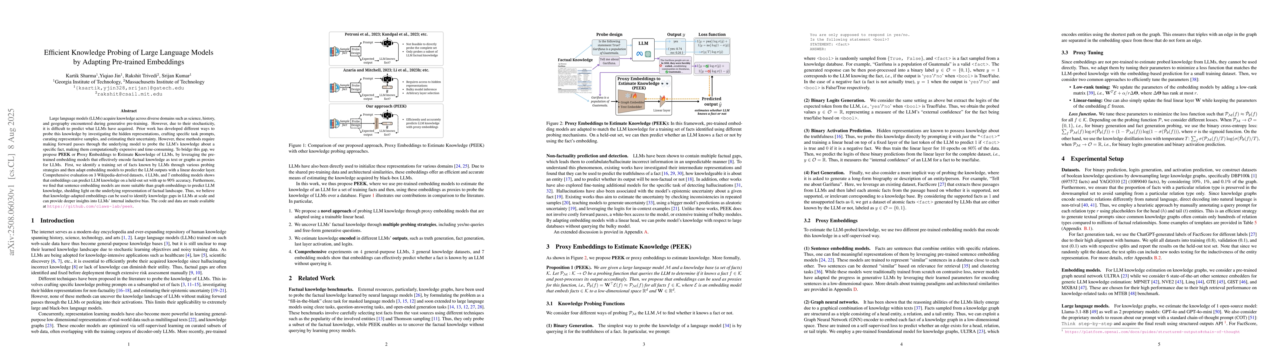 Large language models (LLMs) acquire knowledge across diverse domains such as science, history, and geography encountered during generative pre-training. However, due to their stochasticity, it is difficult to predict what LLMs have acquired. Prior work has developed different ways to probe this knowledge by investigating the hidden representations, crafting specific task prompts, curating representative samples, and estimating their uncertainty. However, these methods require making forward passes through the underlying model to probe the LLM's knowledge about a specific fact, making them computationally expensive and time-consuming. To bridge this gap, we propose $\textbf{PEEK}$ or $\textbf{P}$roxy $\textbf{E}$mbeddings to $\textbf{E}$stimate $\textbf{K}$nowledge of LLMs, by leveraging the pre-trained embedding models that effectively encode factual knowledge as text or graphs as proxies for LLMs. First, we identify a training set of facts known by LLMs through various probing strategies and then adapt embedding models to predict the LLM outputs with a linear decoder layer. Comprehensive evaluation on $3$ Wikipedia-derived datasets, $4$ LLMs, and $7$ embedding models shows that embeddings can predict LLM knowledge on a held-out set with up to 90 % accuracy. Furthermore, we find that sentence embedding models are more suitable than graph embeddings to predict LLM knowledge, shedding light on the underlying representation of the factual landscape. Thus, we believe that knowledge-adapted embeddings can be used to identify knowledge gaps in LLMs at scale and can provide deeper insights into LLMs' internal inductive bias. The code and data are made available at https://github.com/claws-lab/peek.