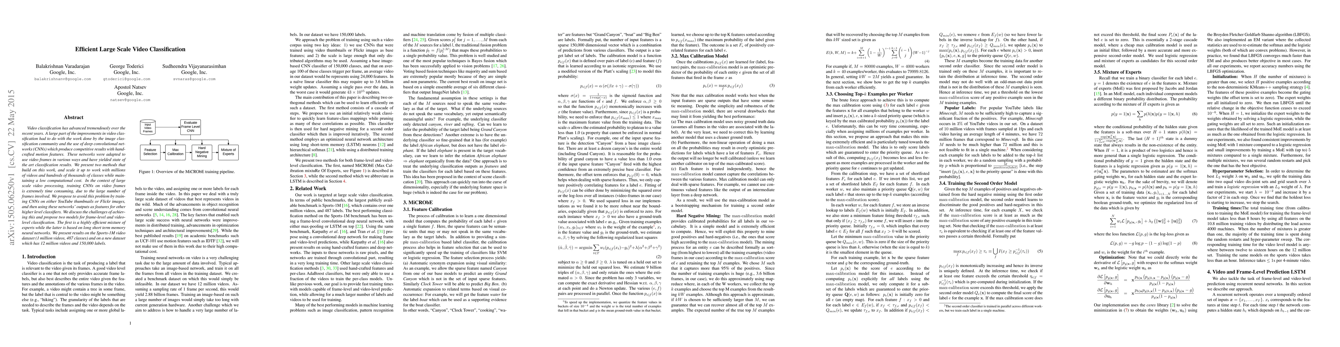 This paper presents two methods for efficient large-scale video classification, leveraging pre-trained CNNs on thumbnails or images to reduce computational costs, and introducing a mixture of experts and LSTM networks for frame-level and video-level classification. Results demonstrate effectiveness on the Sports-1M dataset and a new dataset with 12 million videos.