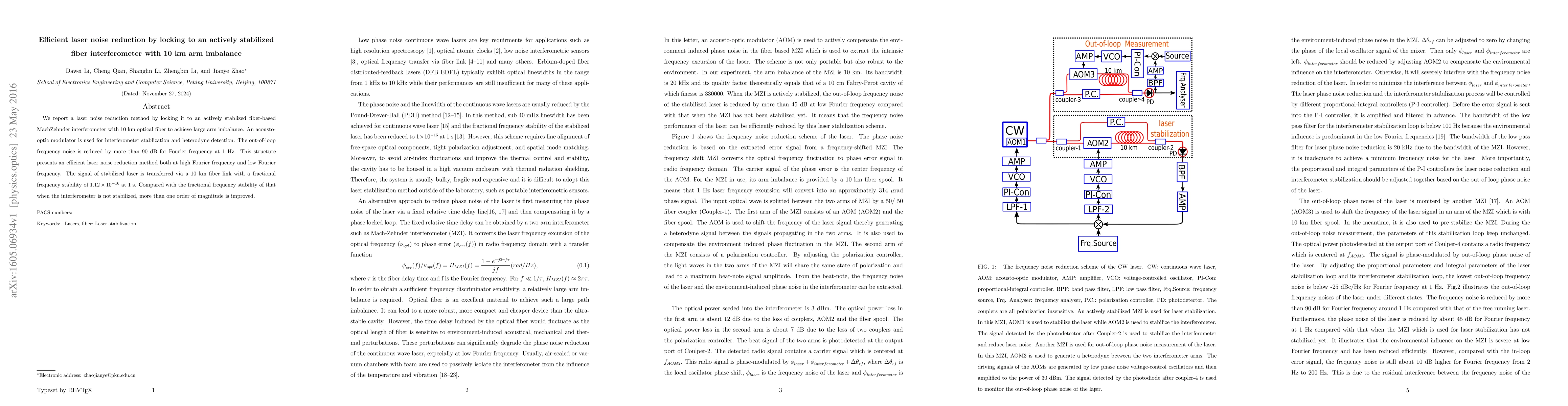 We report a laser noise reduction method by locking it to an actively stabilized fiber-based Mach Zehnder interferometer with 10 km optical fiber to achieve large arm imbalance. An acousto optic modulator is used for interferometer stabilization and heterodyne detection. The out-of-loop frequency noise is reduced by more than 90 dB for Fourier frequency at 1 Hz. This structure presents an efficient laser noise reduction method both at high Fourier frequency and low Fourier frequency. The signal of stabilized laser is transferred via a 10 km fiber link with a fractional frequency stability of 1.12 times 10-16 at 1 s. Compared with the fractional frequency stability of that when the interferometer is not stabilized, more than one order of magnitude is improved.