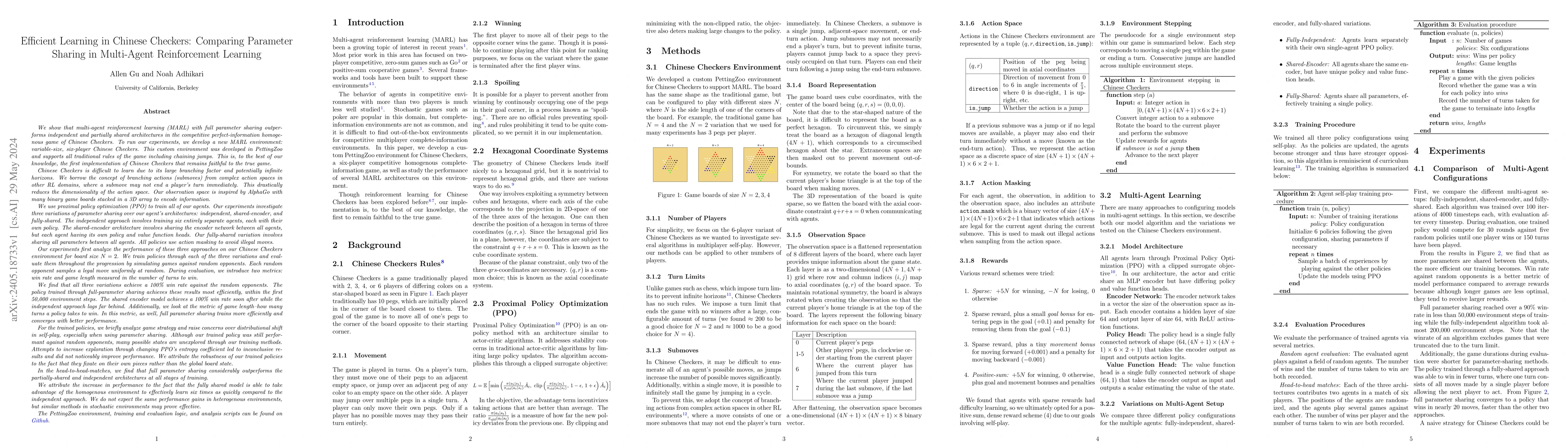 Summary: This paper demonstrates that multi-agent reinforcement learning with full parameter sharing outperforms other architectures in Chinese Checkers, a complex game with a large branching factor. The researchers developed a new six-player MARL environment in PettingZoo that adheres closely to traditional game rules, and they use branching actions and an observation space inspired by AlphaGo to manage the game's complexity.