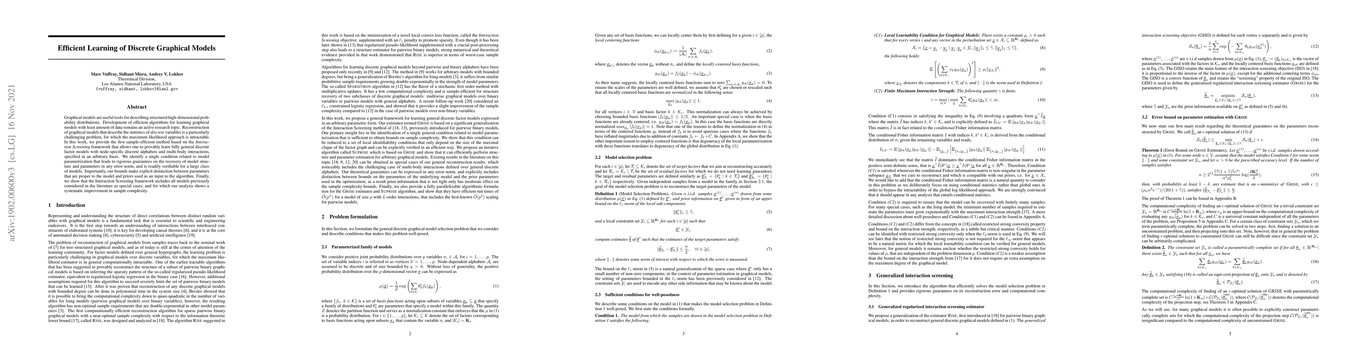 This paper introduces a sample-efficient method based on the Interaction Screening framework for learning fully general discrete graphical models, providing rigorous guarantees on the recovery of model structure and parameters under a verifiable condition. The method improves sample complexity compared to previous approaches.