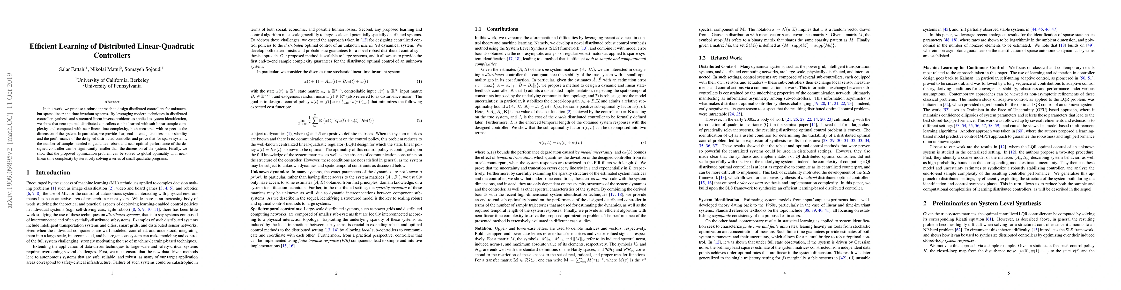 This paper proposes a robust method for designing distributed controllers for sparse linear systems, demonstrating near-optimal performance with sub-linear sample complexity and near-linear time complexity. It provides stability and performance guarantees and solves the optimization problem to global optimality efficiently.