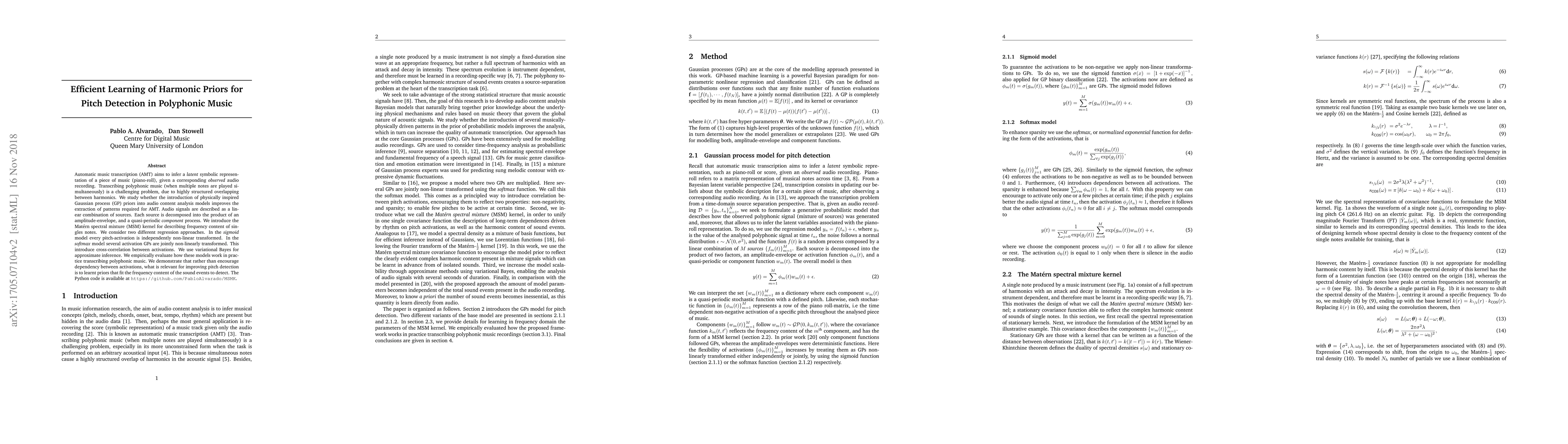 Automatic music transcription (AMT) aims to infer a latent symbolic representation of a piece of music (piano-roll), given a corresponding observed audio recording. Transcribing polyphonic music (when multiple notes are played simultaneously) is a challenging problem, due to highly structured overlapping between harmonics. We study whether the introduction of physically inspired Gaussian process (GP) priors into audio content analysis models improves the extraction of patterns required for AMT. Audio signals are described as a linear combination of sources. Each source is decomposed into the product of an amplitude-envelope, and a quasi-periodic component process. We introduce the Mat\'ern spectral mixture (MSM) kernel for describing frequency content of singles notes. We consider two different regression approaches. In the sigmoid model every pitch-activation is independently non-linear transformed. In the softmax model several activation GPs are jointly non-linearly transformed. This introduce cross-correlation between activations. We use variational Bayes for approximate inference. We empirically evaluate how these models work in practice transcribing polyphonic music. We demonstrate that rather than encourage dependency between activations, what is relevant for improving pitch detection is to learnt priors that fit the frequency content of the sound events to detect.