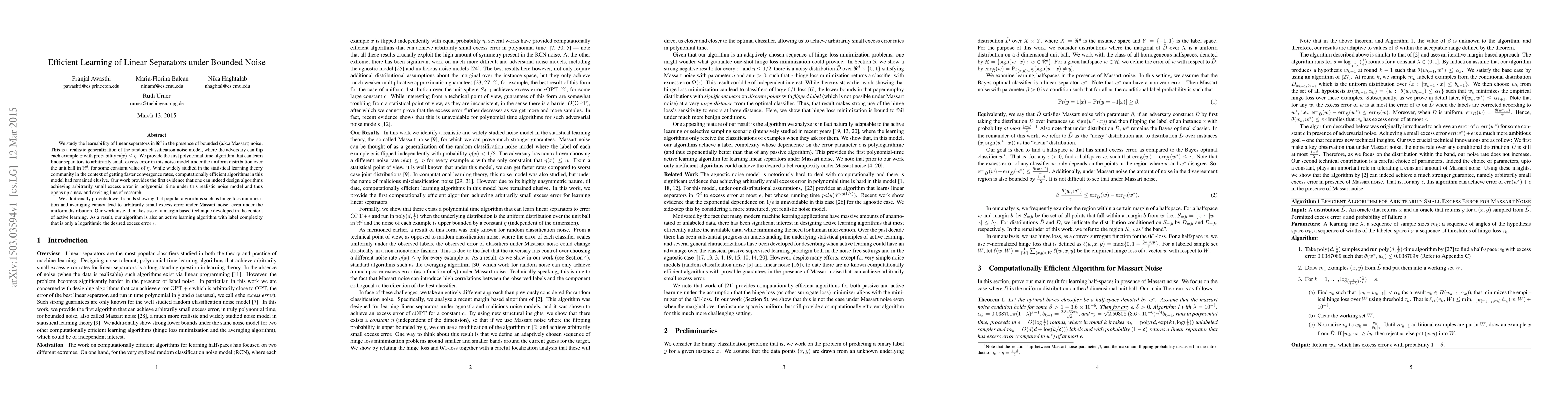 This paper presents the first polynomial time algorithm for learning linear separators under bounded noise, achieving arbitrarily small excess error in the Massart noise model. It demonstrates that traditional methods like hinge loss minimization are insufficient, while the proposed margin-based active learning approach offers a feasible alternative with logarithmic label complexity.