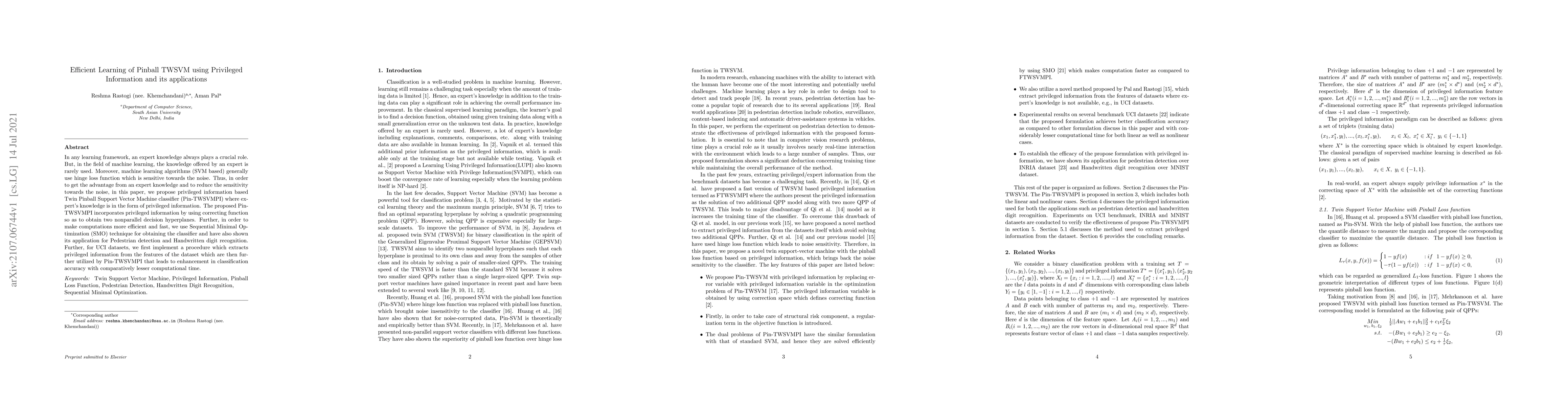 This paper proposes a Twin Pinball Support Vector Machine classifier (Pin-TWSVMPI) that leverages privileged information from experts to enhance learning efficiency and reduce noise sensitivity. The method uses Sequential Minimal Optimization for faster computation and demonstrates applications in pedestrian detection and handwritten digit recognition.