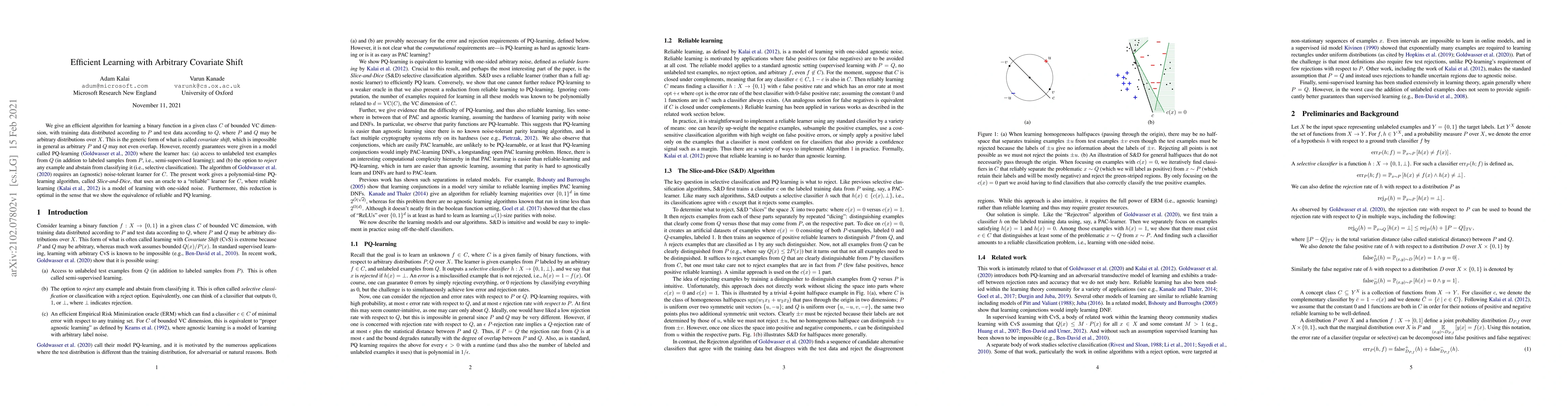 We give an efficient algorithm for learning a binary function in a given class C of bounded VC dimension, with training data distributed according to P and test data according to Q, where P and Q may be arbitrary distributions over X. This is the generic form of what is called covariate shift, which is impossible in general as arbitrary P and Q may not even overlap. However, recently guarantees were given in a model called PQ-learning (Goldwasser et al., 2020) where the learner has: (a) access to unlabeled test examples from Q (in addition to labeled samples from P, i.e., semi-supervised learning); and (b) the option to reject any example and abstain from classifying it (i.e., selective classification). The algorithm of Goldwasser et al. (2020) requires an (agnostic) noise tolerant learner for C. The present work gives a polynomial-time PQ-learning algorithm that uses an oracle to a "reliable" learner for C, where reliable learning (Kalai et al., 2012) is a model of learning with one-sided noise. Furthermore, our reduction is optimal in the sense that we show the equivalence of reliable and PQ learning.