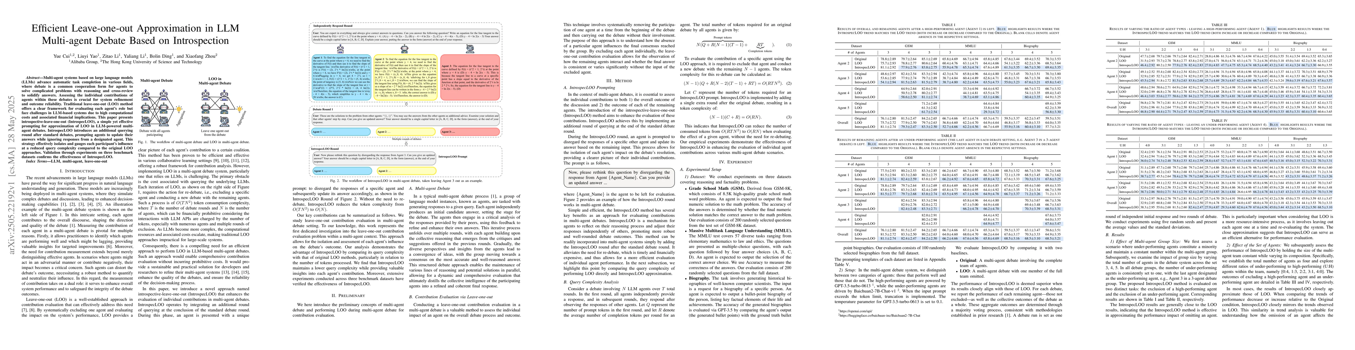 The main technical contribution is the Introspective-Leave-one-out (IntrospecLOO) method, which approximates LOO evaluation in LLM-powered multi-agent debates with reduced query complexity.