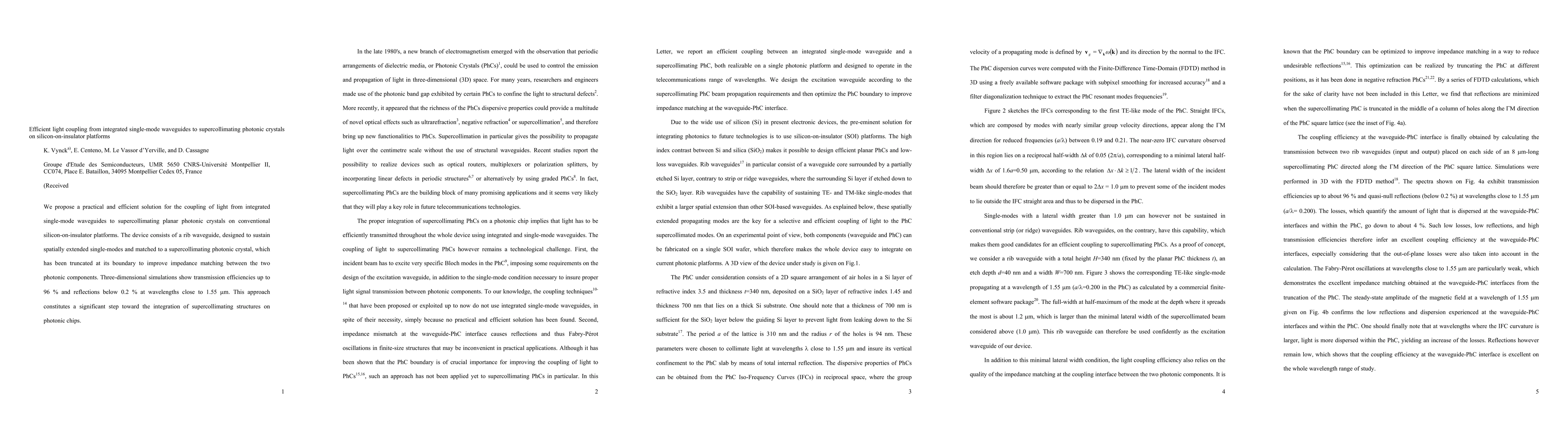 This paper proposes an efficient method for coupling light from single-mode waveguides to supercollimating photonic crystals on silicon-on-insulator platforms, achieving high transmission efficiencies of up to 96% and minimal reflection. The design involves a rib waveguide matched to a truncated photonic crystal to enhance impedance matching.