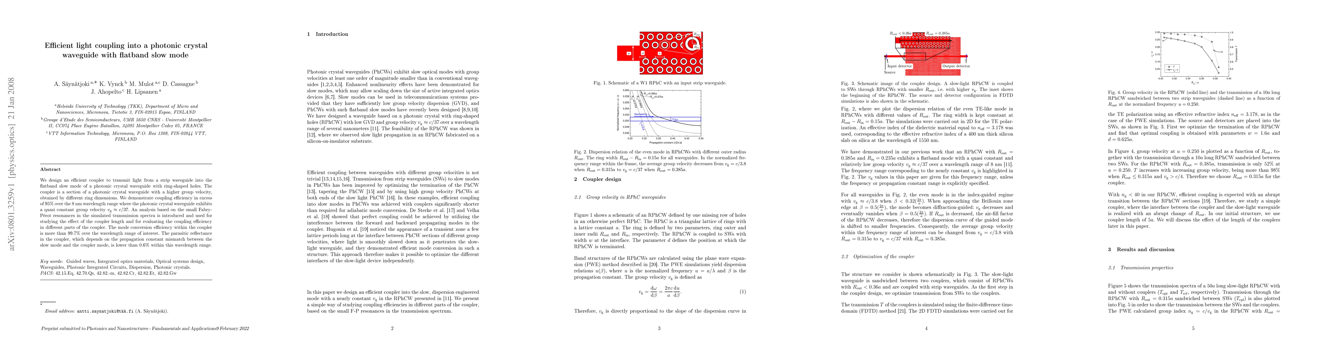 This paper designs an efficient coupler for light transmission into a photonic crystal waveguide’s flatband slow mode, achieving over 95% coupling efficiency over an 8 nm wavelength range with minimal parasitic reflectance. The coupler leverages different ring dimensions to optimize the group velocity and mode conversion efficiency.