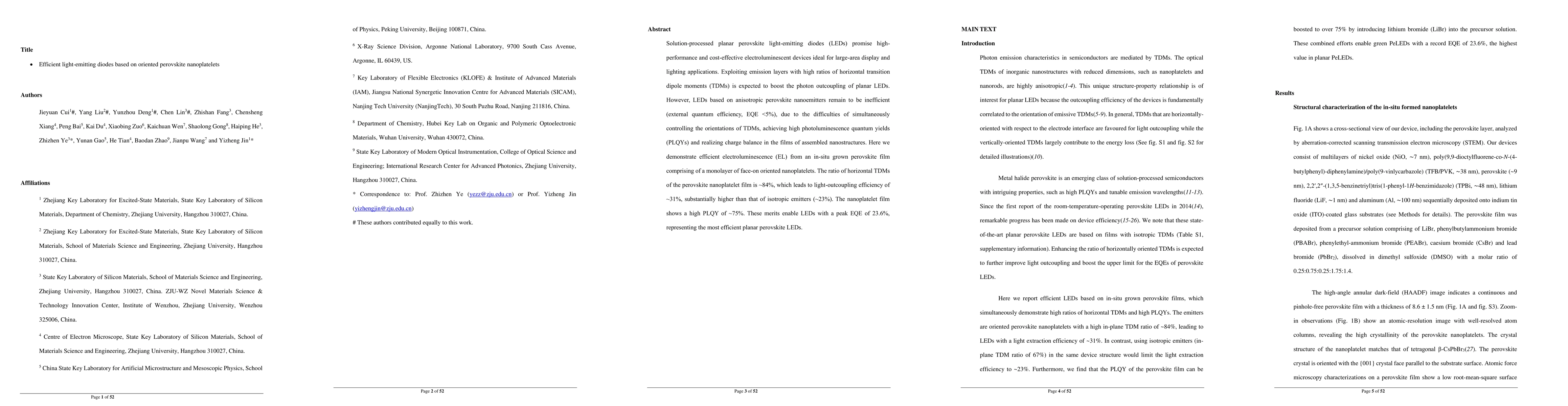 This paper demonstrates efficient perovskite light-emitting diodes (LEDs) using oriented perovskite nanoplatelets, achieving a peak external quantum efficiency of 23.6% due to high horizontal transition dipole moments and a high photoluminescence quantum yield.