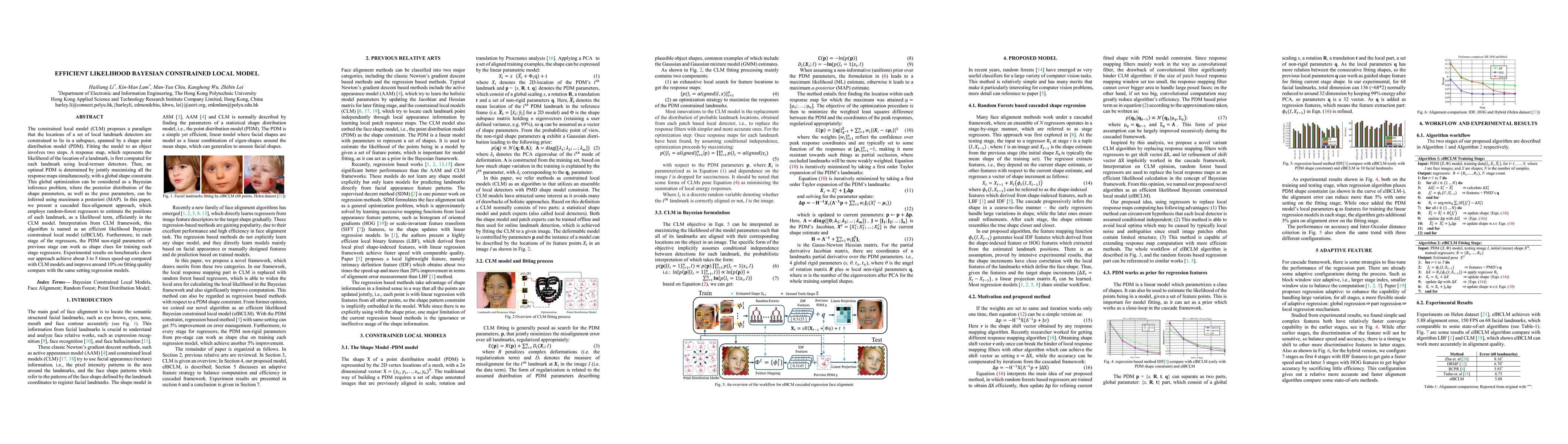 The paper introduces an efficient likelihood Bayesian constrained local model (elBCLM) for face alignment, employing random-forest regressors to quickly estimate landmark positions within a constrained local model framework. The approach achieves significant speed improvements and slightly better fitting quality compared to traditional CLM models.
