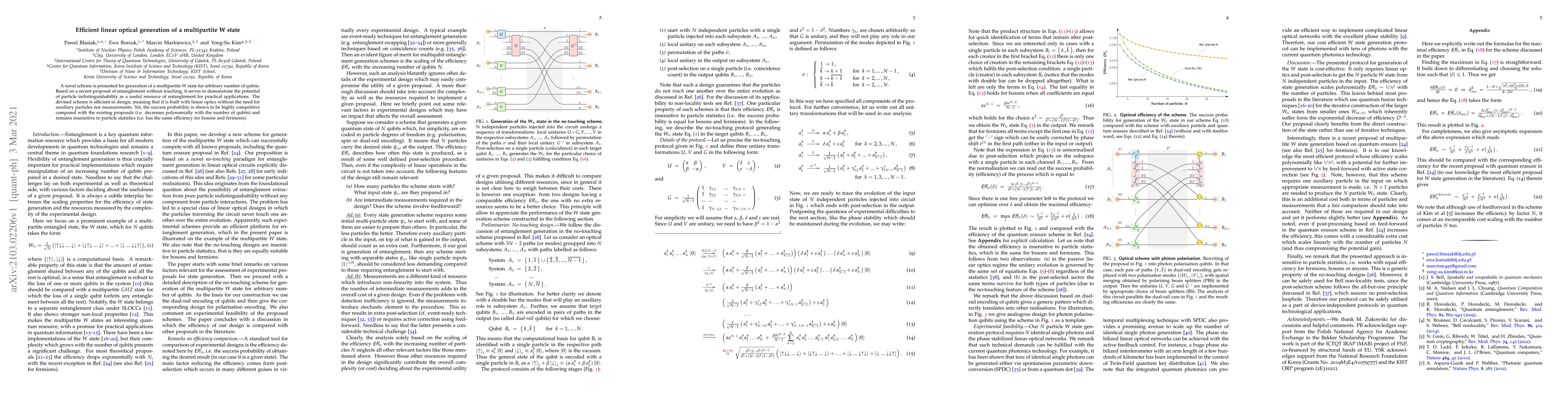 This paper proposes an efficient linear optical scheme for generating multipartite W states without auxiliary particles or measurements, showcasing the potential of particle indistinguishability for entanglement. The scheme's success probability decreases polynomially with the number of qubits and remains efficient for both bosons and fermions.