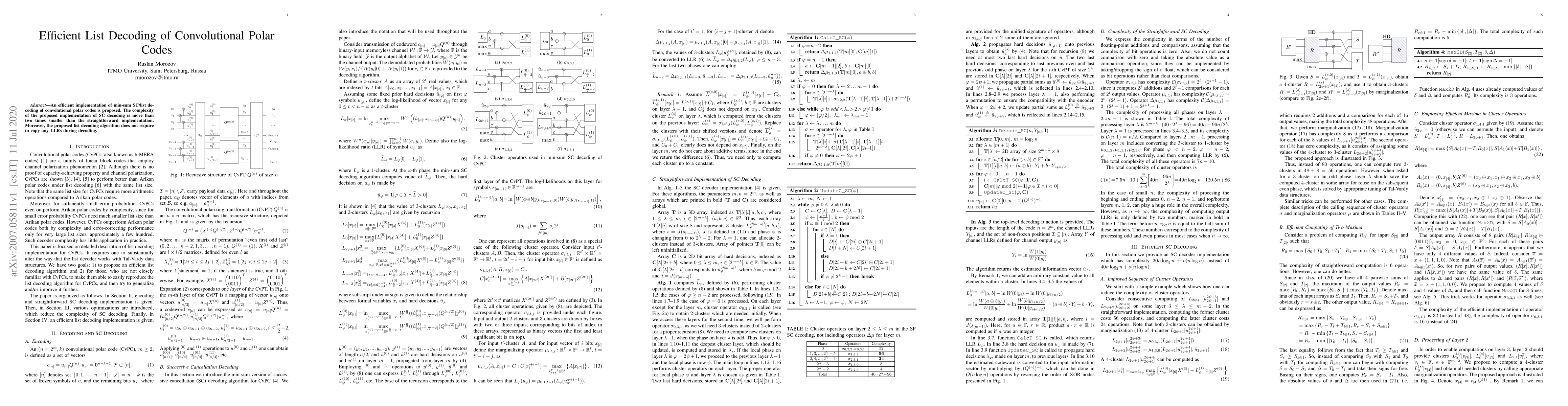 Summary: This paper proposes an efficient min-sum SC/list decoding method for convolutional polar codes, achieving over twice the complexity reduction compared to traditional methods, while eliminating the need for LLR copying during decoding.