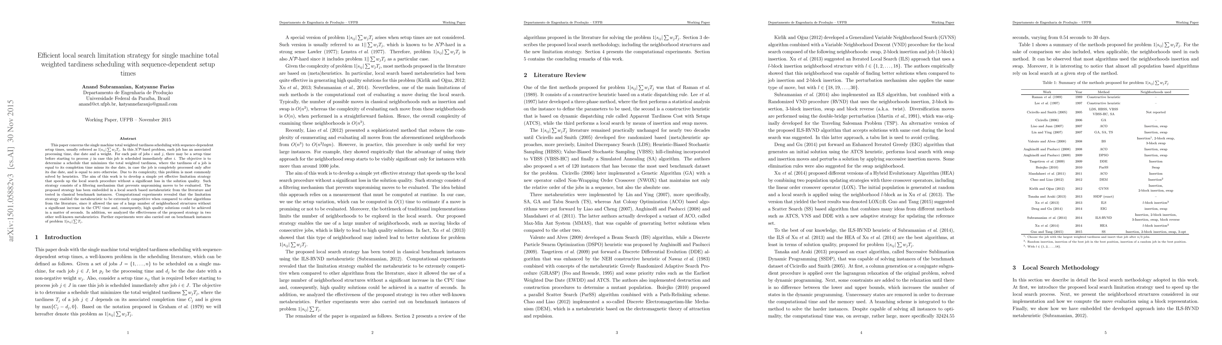 This paper proposes a limitation strategy to enhance local search for minimizing total weighted tardiness in single machine scheduling with sequence-dependent setup times. The strategy effectively filters out unpromising moves, significantly speeding up the local search without compromising solution quality, leading to competitive performance against other algorithms.