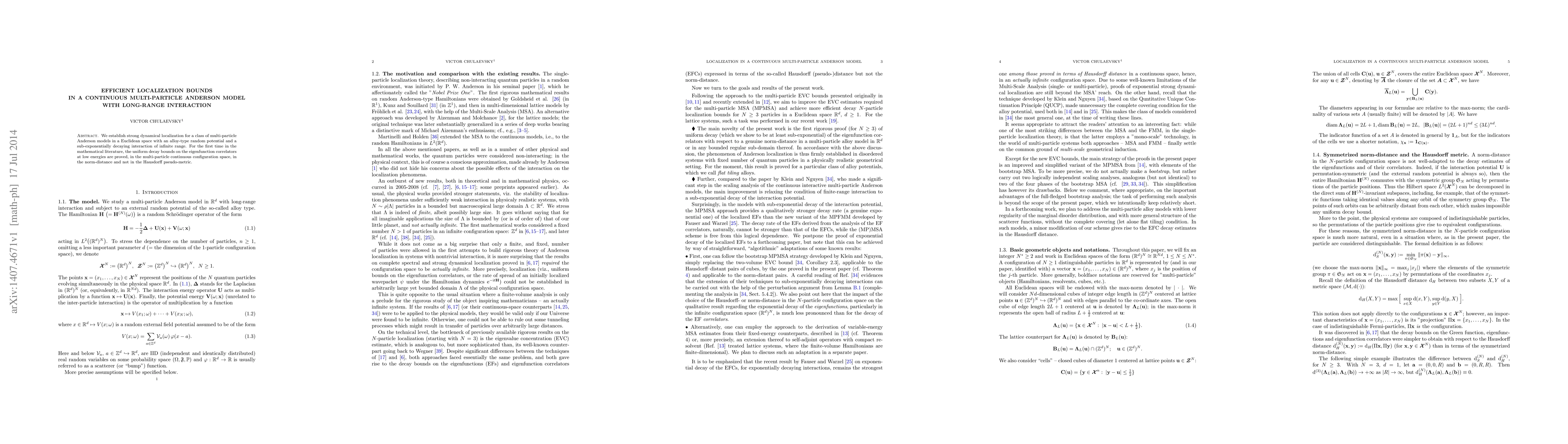 We establish strong dynamical localization for a class of multi-particle Anderson models in a Euclidean space with an alloy-type random potential and a sub-exponentially decaying interaction of infinite range. For the first time in the mathematical literature, the uniform decay bounds on the eigenfunction correlators at low energies are proved, in the multi-particle continuous configuration space, in the norm-distance and not in the Hausdorff pseudo-metric.