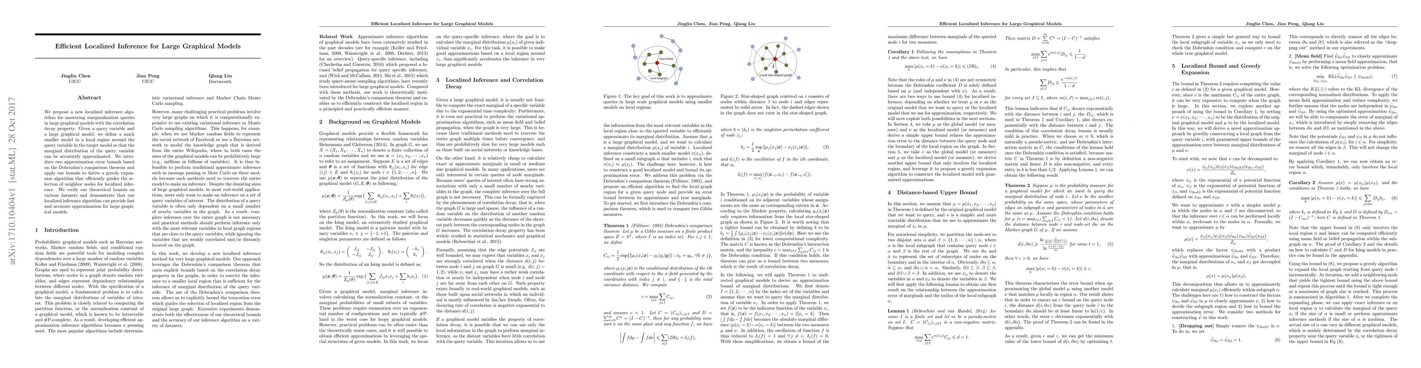We propose a new localized inference algorithm for answering marginalization queries in large graphical models with the correlation decay property. Given a query variable and a large graphical model, we define a much smaller model in a local region around the query variable in the target model so that the marginal distribution of the query variable can be accurately approximated. We introduce two approximation error bounds based on the Dobrushin's comparison theorem and apply our bounds to derive a greedy expansion algorithm that efficiently guides the selection of neighbor nodes for localized inference. We verify our theoretical bounds on various datasets and demonstrate that our localized inference algorithm can provide fast and accurate approximation for large graphical models.