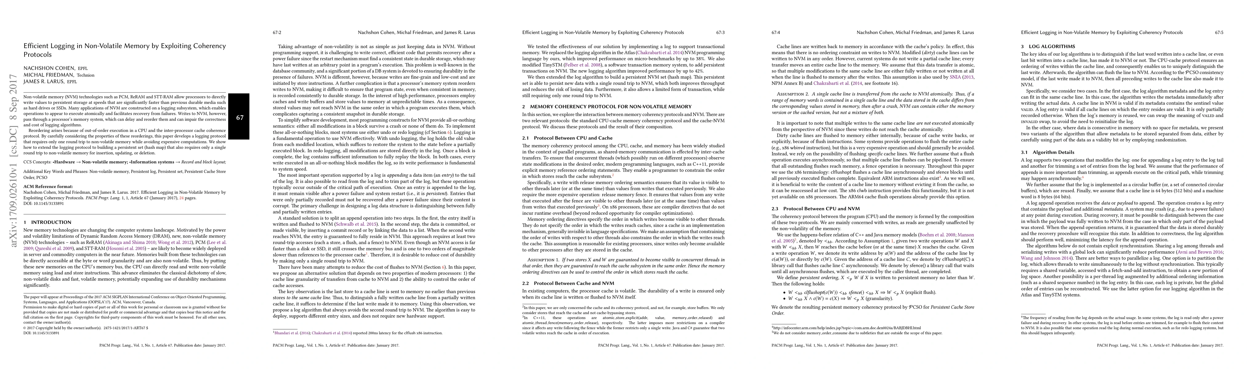 This paper presents an efficient logging protocol for non-volatile memory (NVM) that leverages coherency protocols to minimize round trips to NVM. It ensures atomic operations and recovery from failures with minimal computational overhead, even under CPU out-of-order execution and cache coherence challenges.