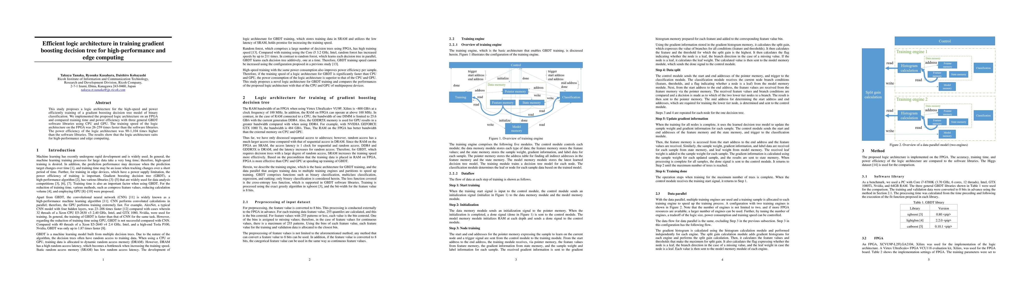 This study proposes a logic architecture for the high-speed and power efficiently training of a gradient boosting decision tree model of binary classification. We implemented the proposed logic architecture on an FPGA and compared training time and power efficiency with three general GBDT software libraries using CPU and GPU. The training speed of the logic architecture on the FPGA was 26-259 times faster than the software libraries. The power efficiency of the logic architecture was 90-1,104 times higher than the software libraries. The results show that the logic architecture suits for high-performance and edge computing.