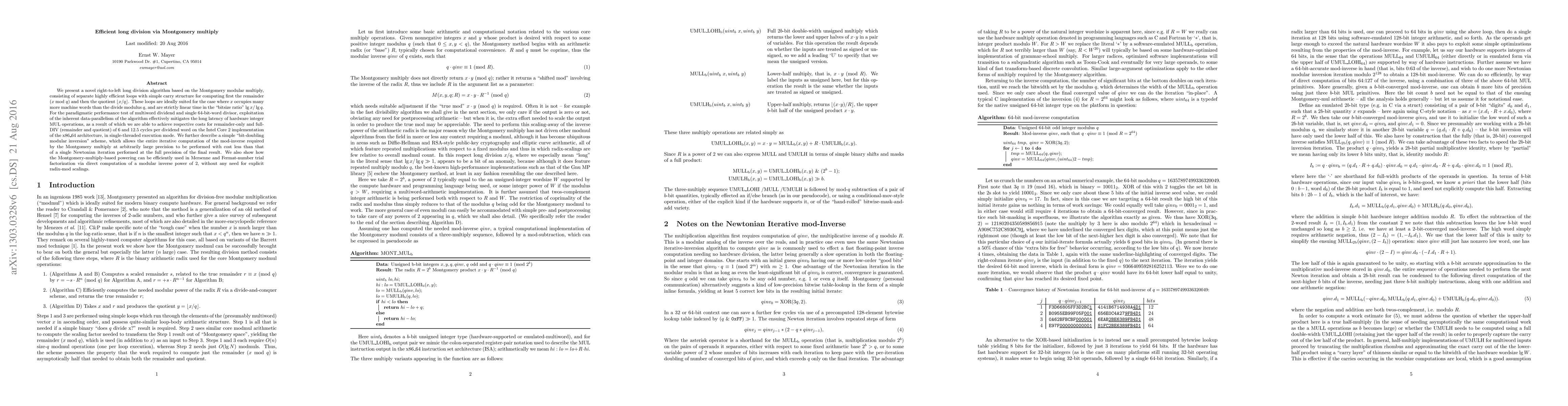 We present a novel right-to-left long division algorithm based on the Montgomery modular multiply, consisting of separate highly efficient loops with simply carry structure for computing first the remainder (x mod q) and then the quotient floor(x/q). These loops are ideally suited for the case where x occupies many more machine words than the divide modulus q, and are strictly linear time in the "bitsize ratio" lg(x)/lg(q). For the paradigmatic performance test of multiword dividend and single 64-bit-word divisor, exploitation of the inherent data-parallelism of the algorithm effectively mitigates the long latency of hardware integer MUL operations, as a result of which we are able to achieve respective costs for remainder-only and full-DIV (remainder and quotient) of 6 and 12.5 cycles per dividend word on the Intel Core 2 implementation of the x86_64 architecture, in single-threaded execution mode. We further describe a simple "bit-doubling modular inversion" scheme, which allows the entire iterative computation of the mod-inverse required by the Montgomery multiply at arbitrarily large precision to be performed with cost less than that of a single Newtonian iteration performed at the full precision of the final result. We also show how the Montgomery-multiply-based powering can be efficiently used in Mersenne and Fermat-number trial factorization via direct computation of a modular inverse power of 2, without any need for explicit radix-mod scalings.
