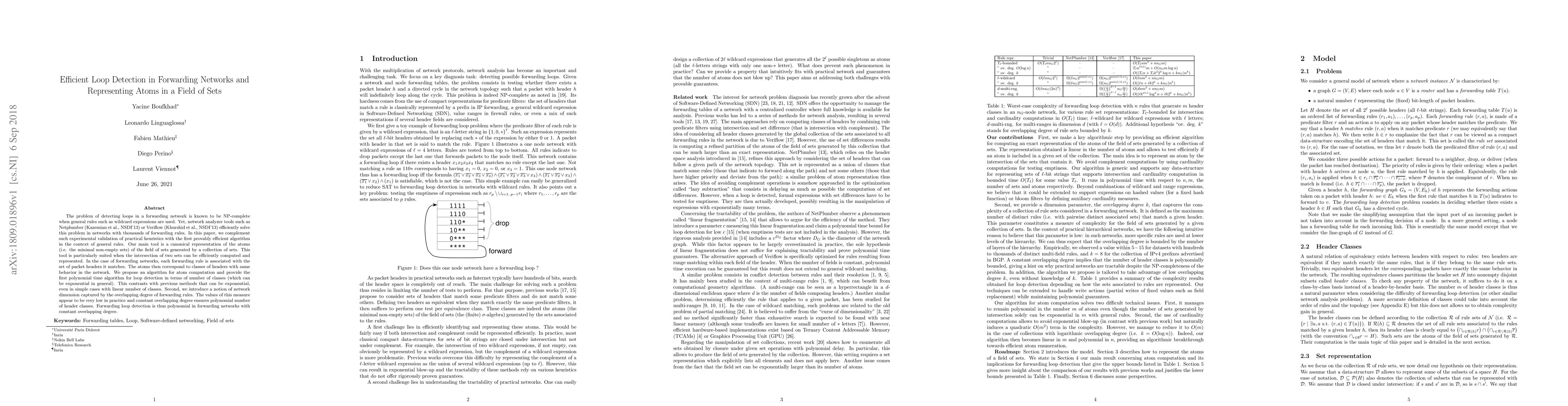 The problem of detecting loops in a forwarding network is known to be NP-complete when general rules such as wildcard expressions are used. Yet, network analyzer tools such as Netplumber (Kazemian et al., NSDI'13) or Veriflow (Khurshid et al., NSDI'13) efficiently solve this problem in networks with thousands of forwarding rules. In this paper, we complement such experimental validation of practical heuristics with the first provably efficient algorithm in the context of general rules. Our main tool is a canonical representation of the atoms (i.e. the minimal non-empty sets) of the field of sets generated by a collection of sets. This tool is particularly suited when the intersection of two sets can be efficiently computed and represented. In the case of forwarding networks, each forwarding rule is associated with the set of packet headers it matches. The atoms then correspond to classes of headers with same behavior in the network. We propose an algorithm for atom computation and provide the first polynomial time algorithm for loop detection in terms of number of classes (which can be exponential in general). This contrasts with previous methods that can be exponential, even in simple cases with linear number of classes. Second, we introduce a notion of network dimension captured by the overlapping degree of forwarding rules. The values of this measure appear to be very low in practice and constant overlapping degree ensures polynomial number of header classes. Forwarding loop detection is thus polynomial in forwarding networks with constant overlapping degree.