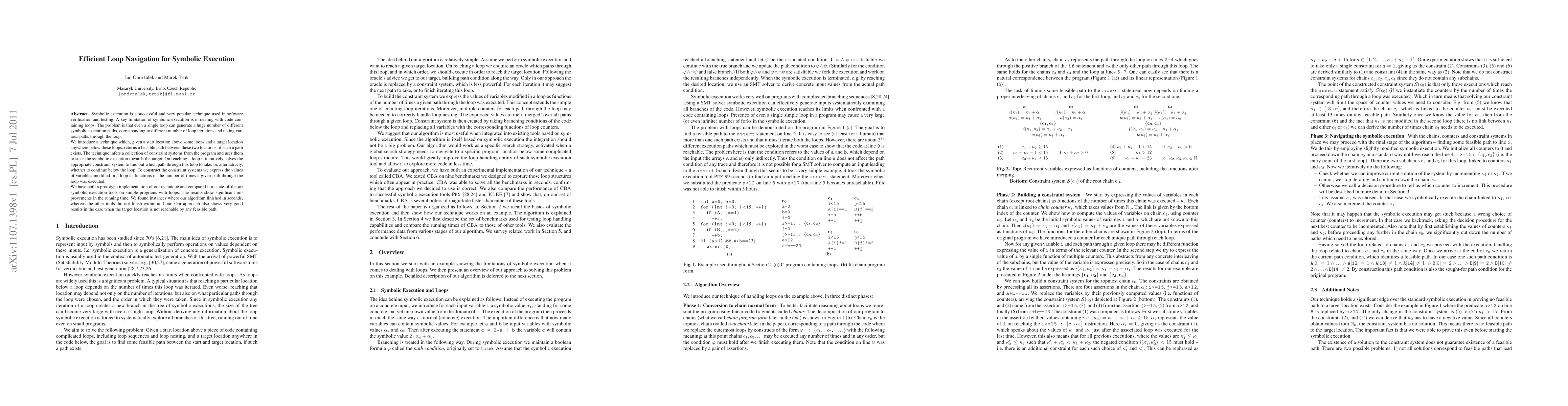 This paper introduces a novel technique for efficiently navigating loops in symbolic execution, improving running time by inferring constraint systems to guide the execution path. The prototype implementation demonstrated significant performance gains compared to existing tools, especially in scenarios where target locations are not reachable.
