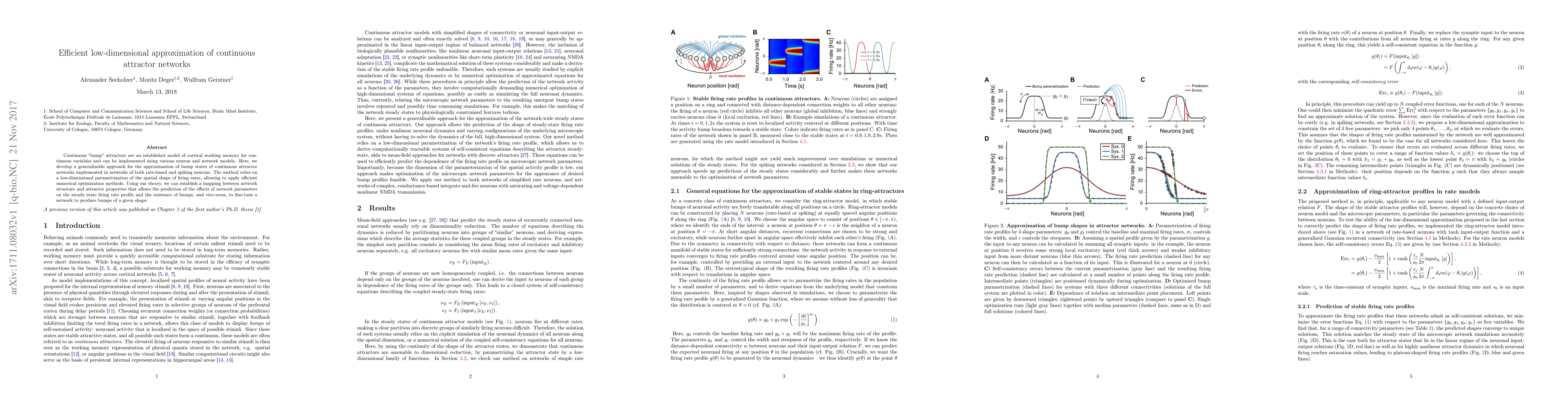 This paper presents a method for efficiently approximating "bump" attractors in continuous attractor networks using low-dimensional parametrization, applicable to both rate-based and spiking neuron models. The approach enables the prediction and fine-tuning of network parameters to produce desired bump shapes.