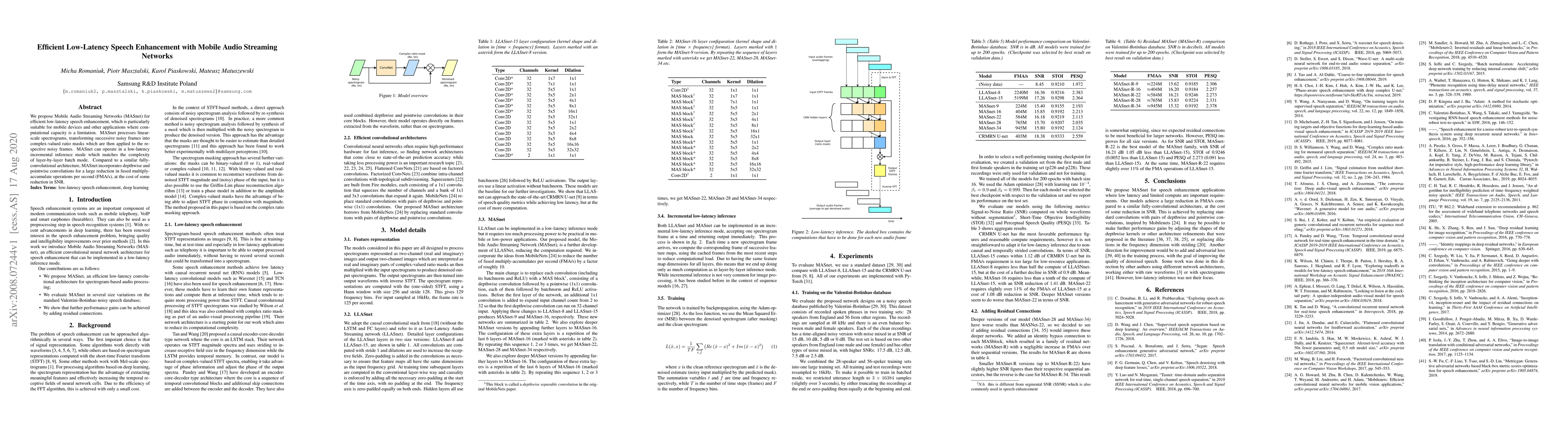 This paper introduces Mobile Audio Streaming Networks (MASnet) for low-latency speech enhancement on mobile devices, utilizing linear-scale spectrograms and complex-valued ratio masks. MASnet achieves significant reductions in computational load through depthwise and pointwise convolutions, though it slightly compromises signal-to-noise ratio (SNR).
