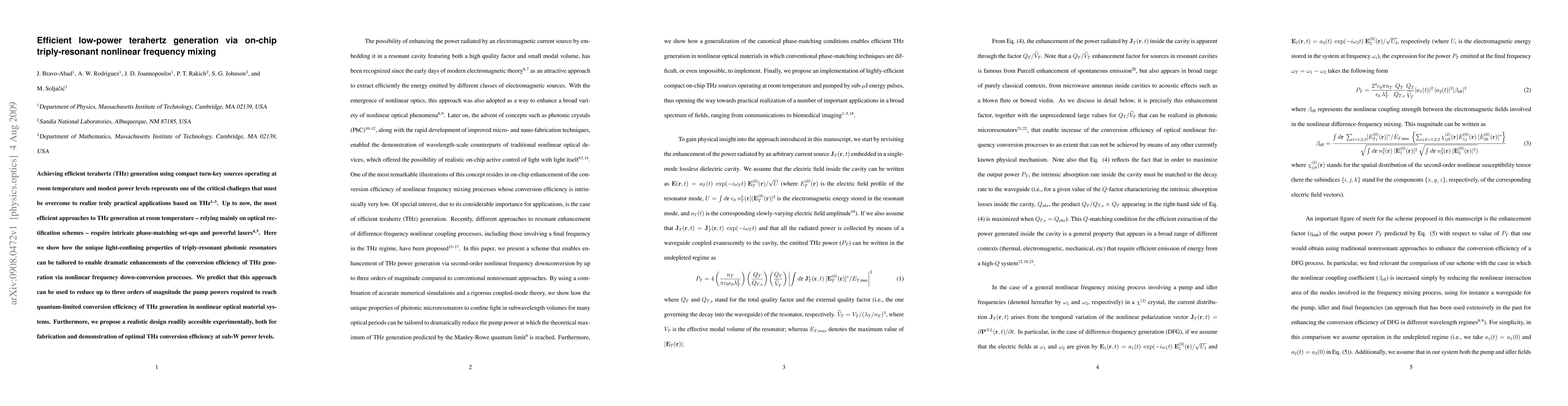 This paper demonstrates a novel on-chip triply-resonant nonlinear frequency mixing method for efficient, low-power terahertz generation at room temperature, significantly reducing required pump powers and enabling practical THz applications. The proposed design offers a compact, turn-key solution with optimal efficiency at sub-W power levels.