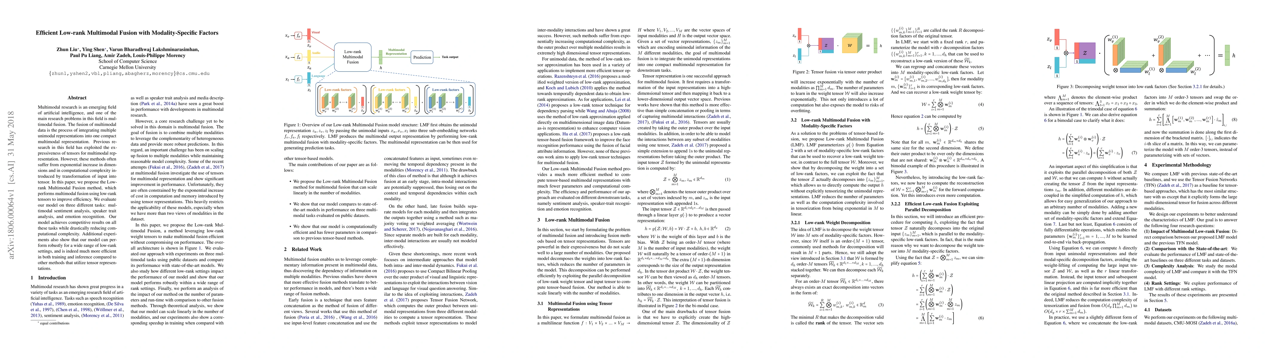 This paper proposes a Low-rank Multimodal Fusion method to efficiently integrate multiple unimodal representations into a compact multimodal representation, addressing the high computational complexity of tensor-based methods. The model achieves competitive performance across multimodal tasks while significantly reducing computational costs.