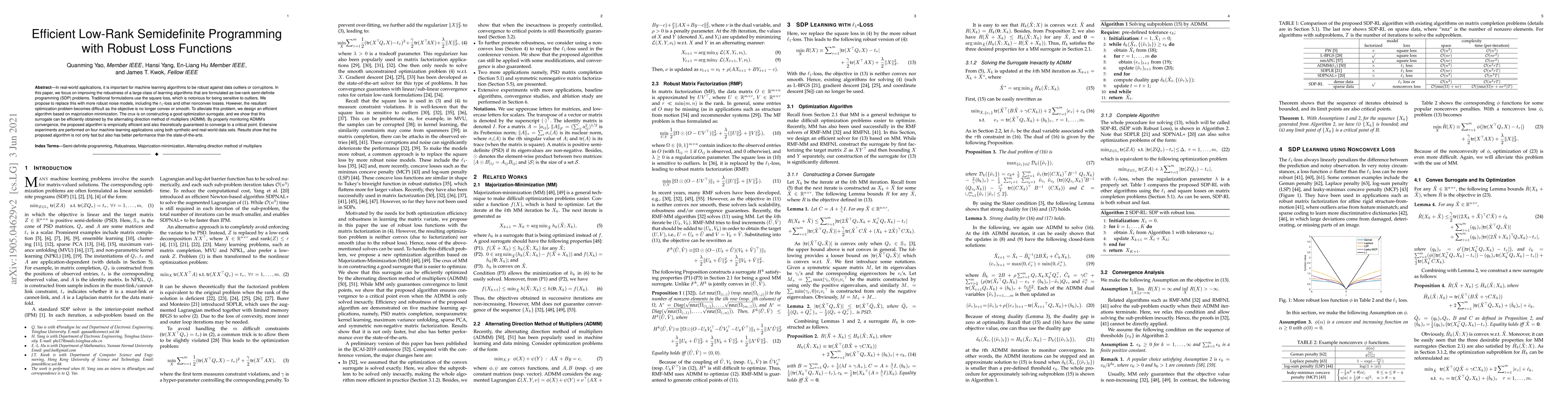 In real-world applications, it is important for machine learning algorithms to be robust against data outliers or corruptions. In this paper, we focus on improving the robustness of a large class of learning algorithms that are formulated as low-rank semi-definite programming (SDP) problems. Traditional formulations use square loss, which is notorious for being sensitive to outliers. We propose to replace this with more robust noise models, including the $\ell_1$-loss and other nonconvex losses. However, the resultant optimization problem becomes difficult as the objective is no longer convex or smooth. To alleviate this problem, we design an efficient algorithm based on majorization-minimization. The crux is on constructing a good optimization surrogate, and we show that this surrogate can be efficiently obtained by the alternating direction method of multipliers (ADMM). By properly monitoring ADMM's convergence, the proposed algorithm is empirically efficient and also theoretically guaranteed to converge to a critical point. Extensive experiments are performed on four machine learning applications using both synthetic and real-world data sets. Results show that the proposed algorithm is not only fast but also has better performance than the state-of-the-art.