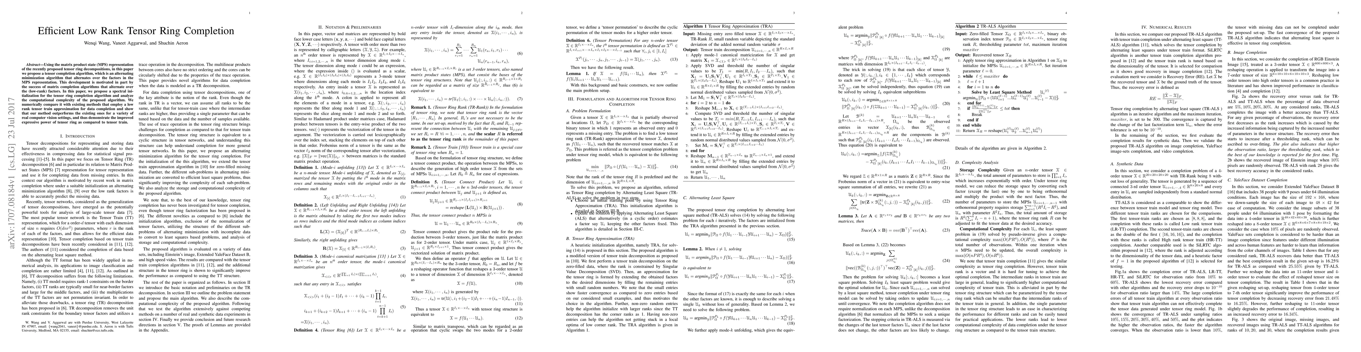 This paper proposes a tensor completion algorithm based on matrix product state (MPS) representation of tensor ring decompositions, utilizing an alternating minimization approach. The authors introduce a spectral initialization and demonstrate superior performance compared to existing low-rank tensor train methods in various computer vision applications.