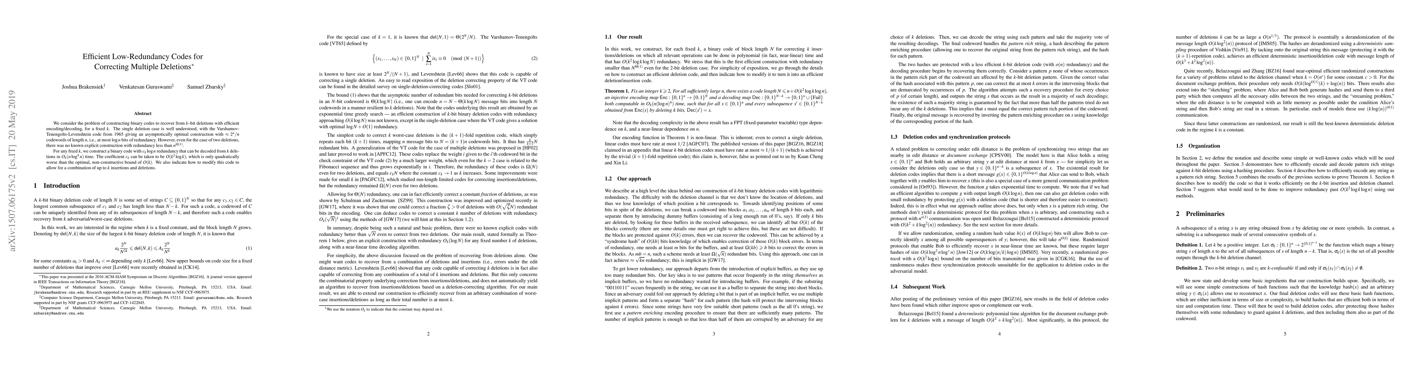 Researchers developed a binary code for correcting multiple deletions with efficient encoding/decoding, achieving redundancy of $c_k imes n$ bits with decoding time of $O_k(n imes ext{log}^4 n)$.
