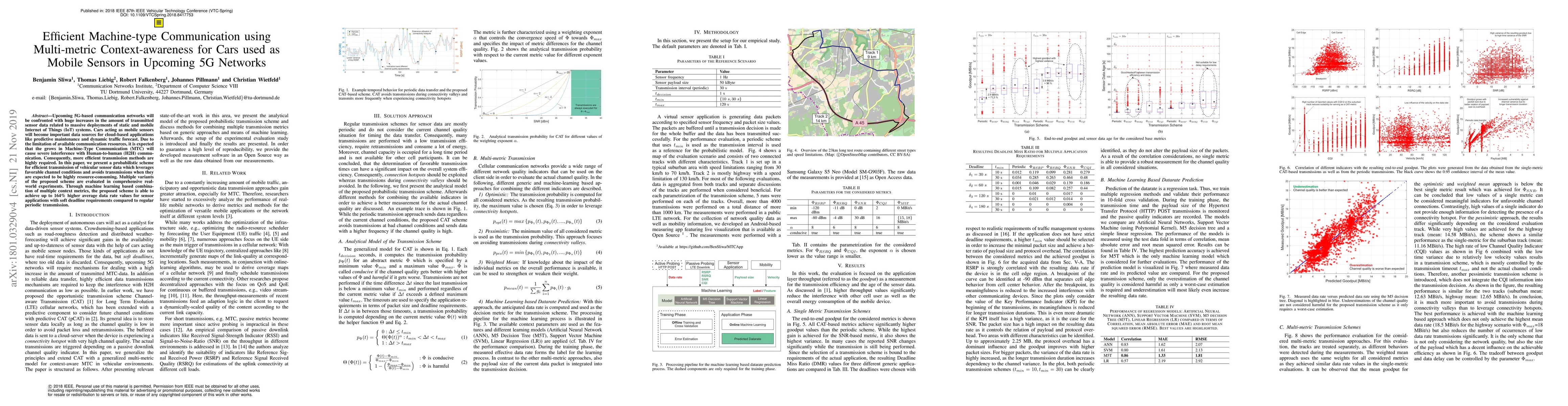 Upcoming 5G-based communication networks will be confronted with huge increases in the amount of transmitted sensor data related to massive deployments of static and mobile Internet of Things (IoT) systems. Cars acting as mobile sensors will become important data sources for cloud-based applications like predictive maintenance and dynamic traffic forecast. Due to the limitation of available communication resources, it is expected that the grows in Machine-Type Communication (MTC) will cause severe interference with Human-to-human (H2H) communication. Consequently, more efficient transmission methods are highly required. In this paper, we present a probabilistic scheme for efficient transmission of vehicular sensor data which leverages favorable channel conditions and avoids transmissions when they are expected to be highly resource-consuming. Multiple variants of the proposed scheme are evaluated in comprehensive realworld experiments. Through machine learning based combination of multiple context metrics, the proposed scheme is able to achieve up to 164% higher average data rate values for sensor applications with soft deadline requirements compared to regular periodic transmission.