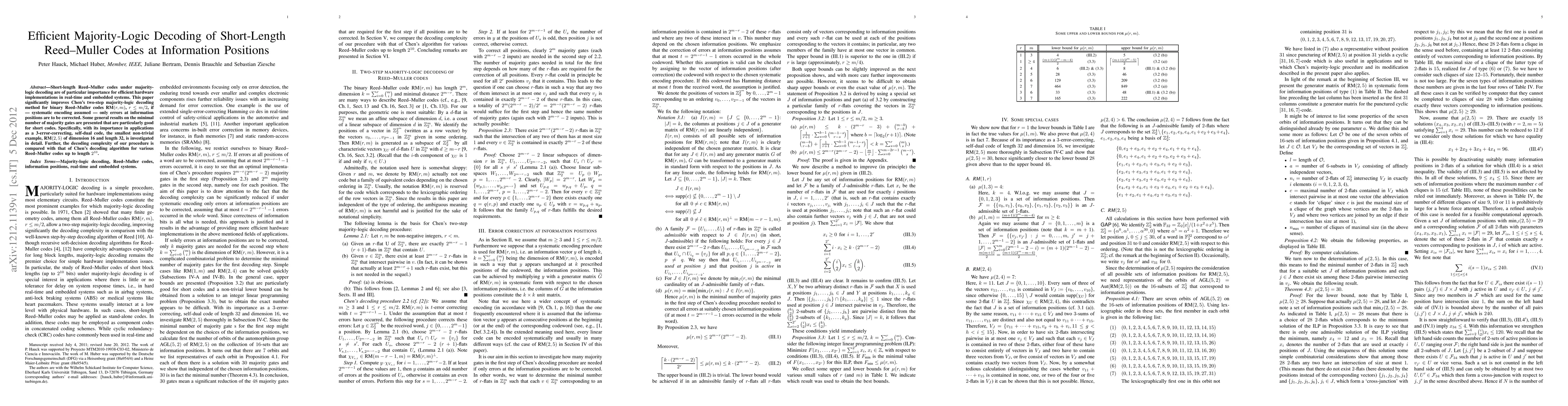 This paper improves a method for decoding short-length Reed-Muller codes efficiently, with a focus on correcting errors at information positions in real-time systems, and investigates the smallest non-trivial example of a self-dual code.