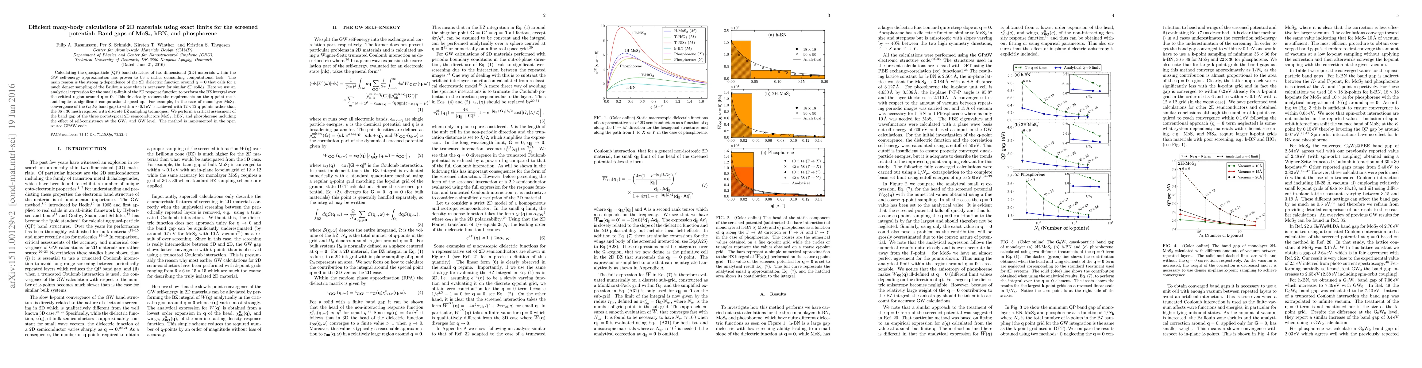 This research introduces an analytical method using the small q-limit of the 2D response function to calculate the quasiparticle band structure of 2D materials like MoS2, hBN, and phosphorene. This approach drastically reduces computational requirements, achieving accurate band gap results with fewer q-points, significantly speeding up G0W0 calculations in the GPAW code.