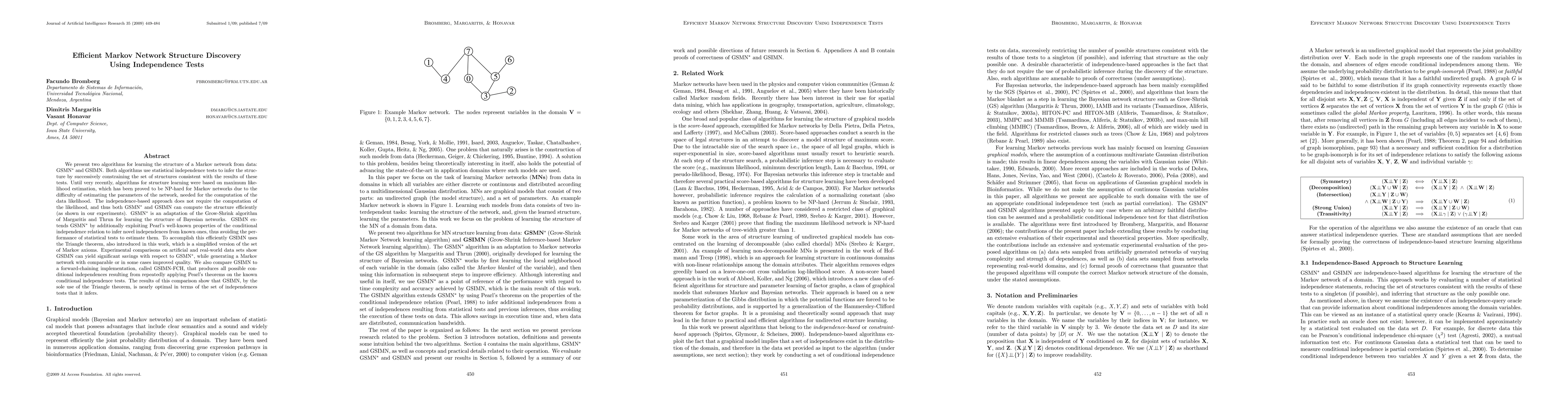 This paper introduces two algorithms, GSMN* and GSIMN, for efficiently discovering the structure of Markov networks using statistical independence tests instead of maximum likelihood estimation. GSIMN extends GSMN* by leveraging Pearl's conditional independence properties and the Triangle theorem to infer novel independences, achieving significant computational savings while maintaining or improving network quality.