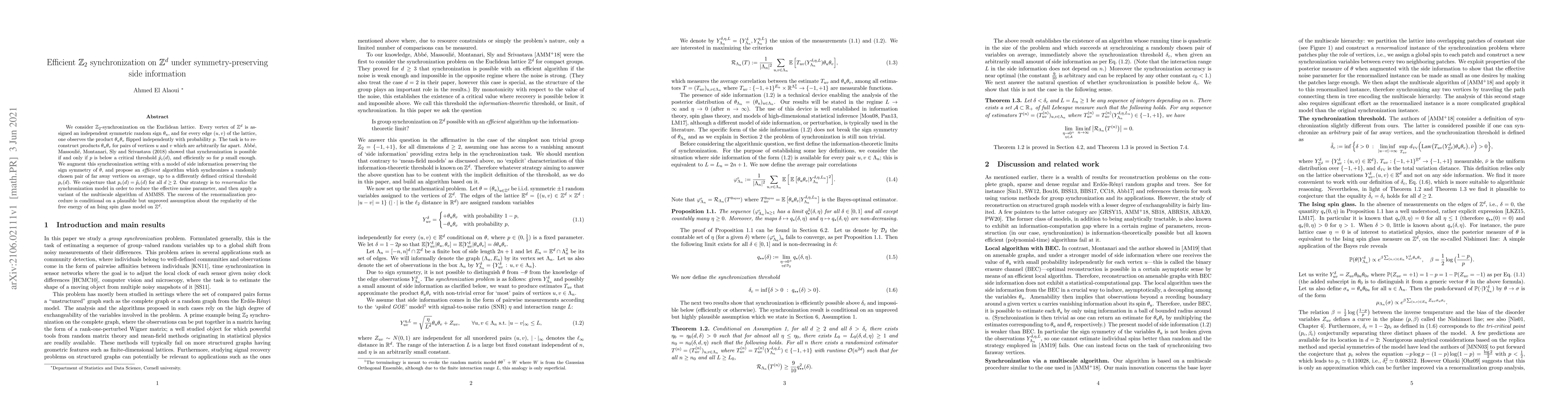 This research introduces an efficient algorithm for $mathbb{Z}_2$ synchronization on $mathbb{Z}^d$ using symmetry-preserving side information. The method reduces noise through renormalization, leveraging assumptions about the Ising spin glass model's free energy regularity. The authors conjecture that their critical threshold $p_c(d)$ equals the previously established $ ilde{p}_c(d)$ for all $d geq 2$.