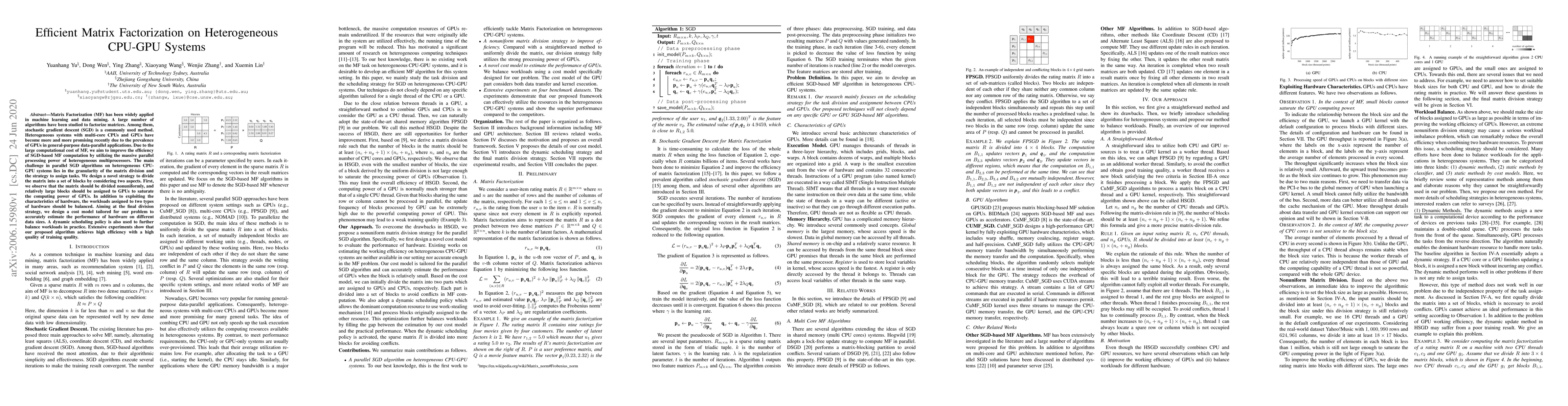 This paper proposes an efficient matrix factorization method using stochastic gradient descent on heterogeneous CPU-GPU systems. It introduces a novel strategy to nonuniformly divide the matrix into blocks, assigning larger blocks to GPUs to maximize their parallel processing power while balancing workloads between CPU and GPU. The method employs a tailored cost model and dynamic scheduling to optimize performance, achieving high efficiency and training quality.