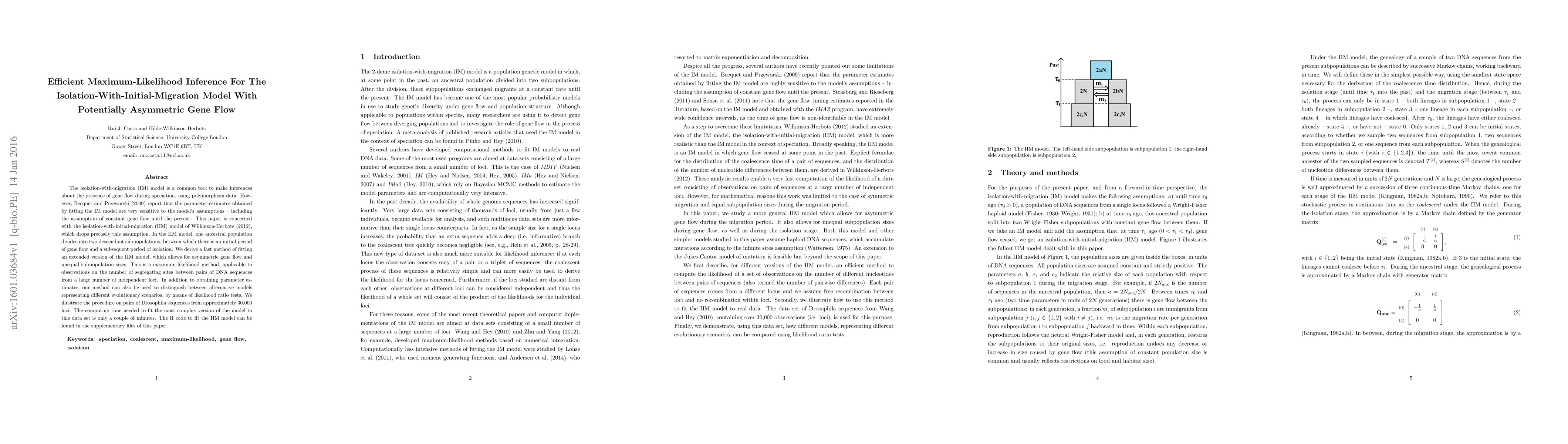 This paper introduces an efficient maximum-likelihood method for fitting the isolation-with-initial-migration (IIM) model, which accounts for asymmetric gene flow and unequal subpopulation sizes. The method is demonstrated using Drosophila DNA sequence data from 30,000 loci, providing accurate parameter estimates and model selection capabilities within minutes.