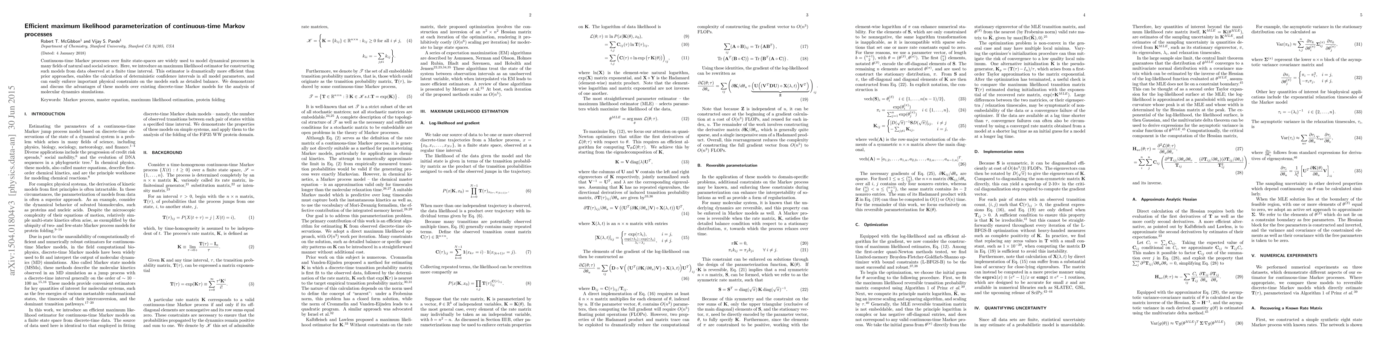 The paper presents a highly efficient maximum likelihood estimator for continuous-time Markov processes, significantly improving upon previous methods by allowing for the calculation of deterministic confidence intervals and enforcing physical constraints. The new approach outperforms discrete-time Markov models in analyzing molecular dynamics simulations.