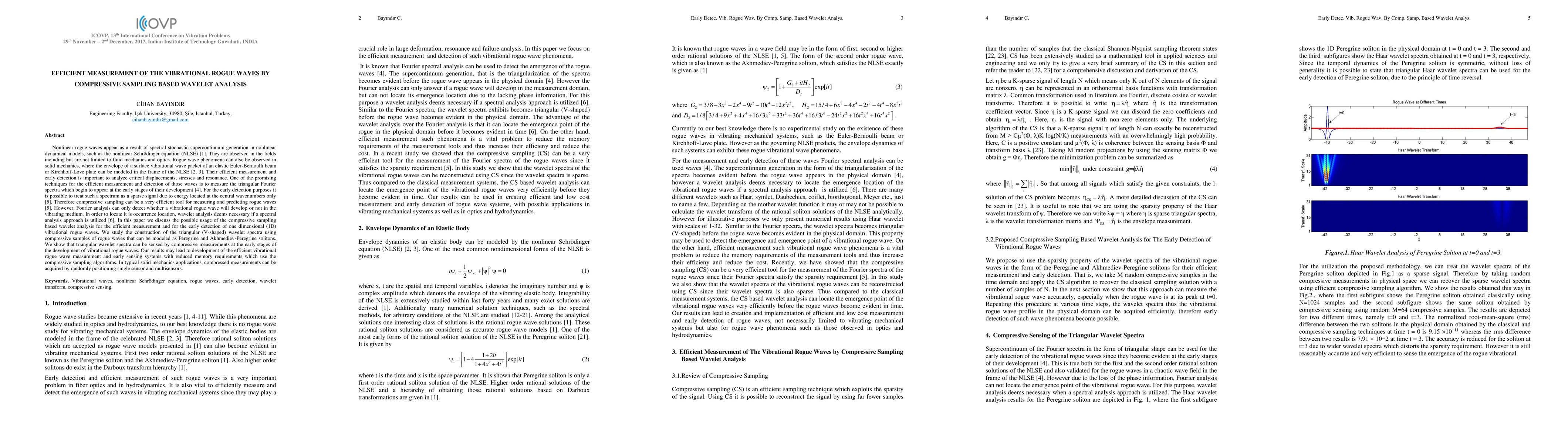 This paper explores the use of compressive sampling based wavelet analysis for efficient measurement and early detection of one-dimensional vibrational rogue waves, modeled as Peregrine and Akhmediev-Peregrine solitons. The study demonstrates that triangular wavelet spectra can be sensed through compressive measurements, potentially leading to reduced memory systems for rogue wave detection in solid mechanics.