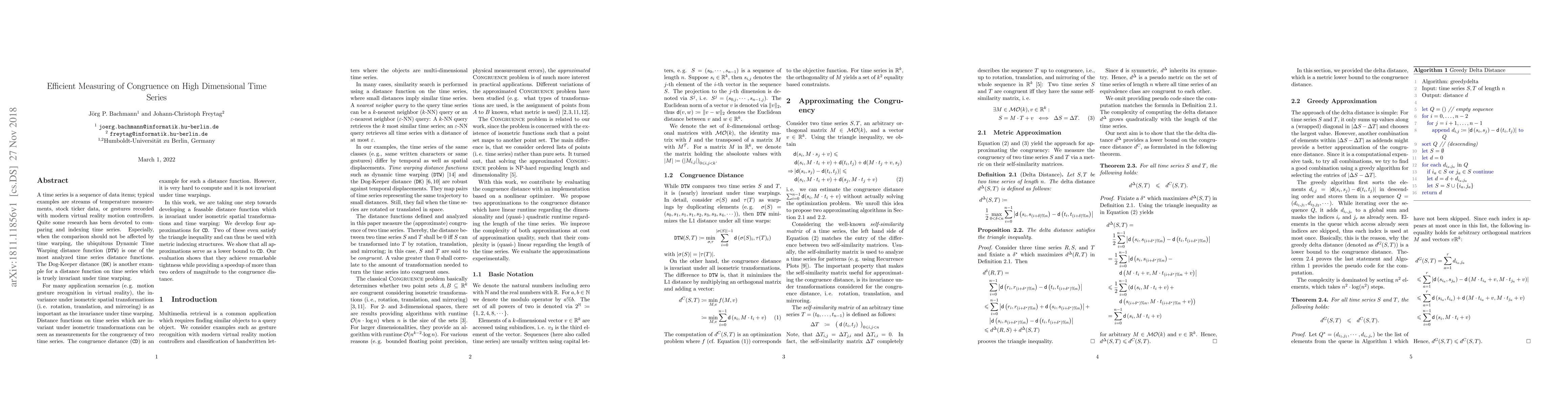 This paper develops four approximations for the computationally expensive congruence distance ($\texttt{CD}$) on high-dimensional time series, aiming for invariance under both isometric spatial transformations and time warping. The approximations achieve significant speedups and provide tight lower bounds, enabling efficient indexing and comparison of time series.