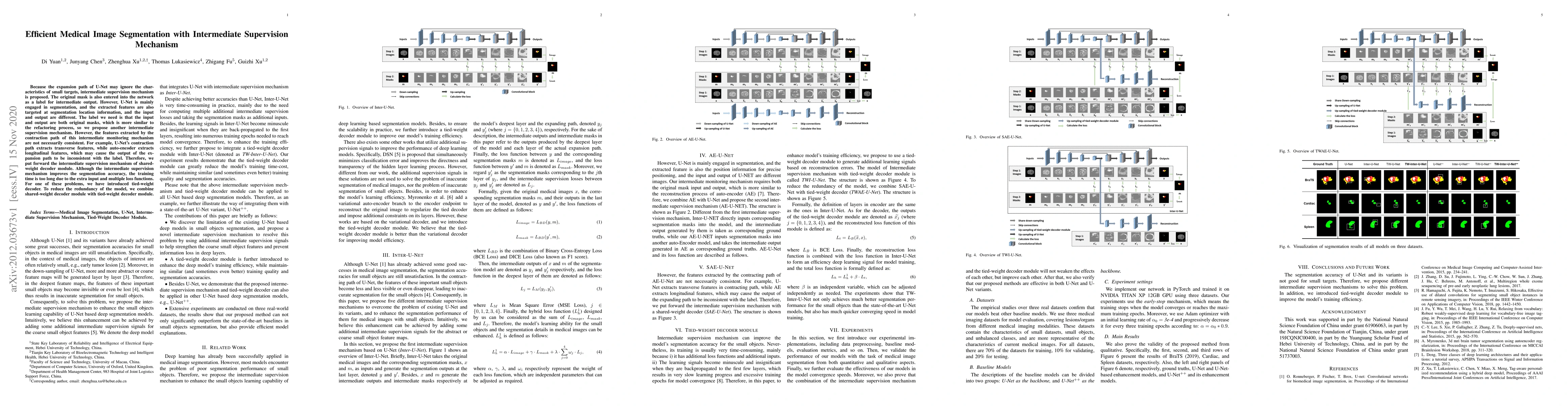 This paper proposes an intermediate supervision mechanism to improve U-Net's medical image segmentation, especially for small targets, by incorporating original masks into the network. To address training time issues, the authors combine shared-weight and tied-weight decoder modules to enhance segmentation accuracy while reducing redundancy.