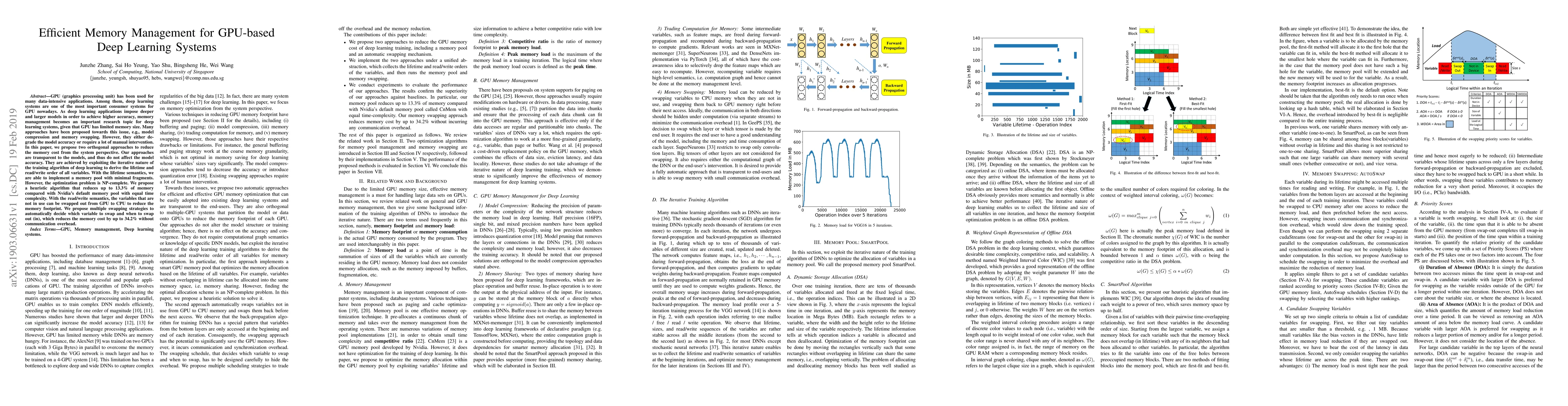 This paper proposes two orthogonal approaches to optimize memory management in GPU-based deep learning systems without affecting model accuracy. The methods leverage the iterative nature of training algorithms to minimize memory fragmentation and swap unused variables from GPU to CPU, achieving up to 13.3% and 34.2% reductions in memory usage respectively.