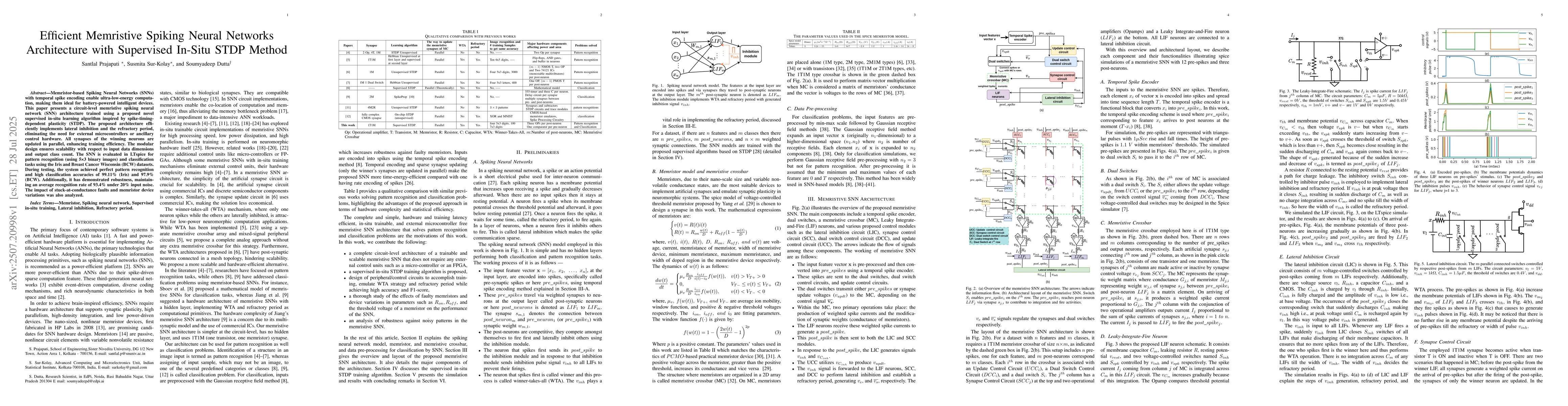 The paper presents a circuit-level memristive spiking neural network (SNN) architecture trained using a novel supervised in-situ learning algorithm inspired by spike-timing-dependent plasticity (STDP). The architecture efficiently implements lateral inhibition and refractory periods, eliminating the need for external microcontrollers.