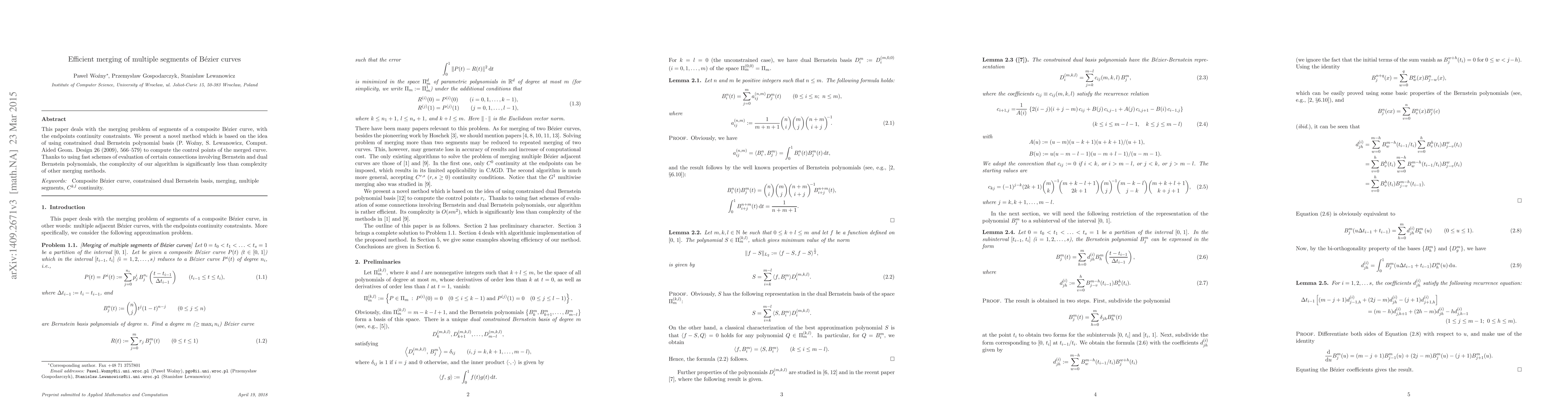 This paper introduces a novel method for efficiently merging segments of composite Bézier curves while maintaining endpoint continuity, utilizing constrained dual Bernstein polynomials. The proposed algorithm significantly reduces computational complexity compared to existing methods.