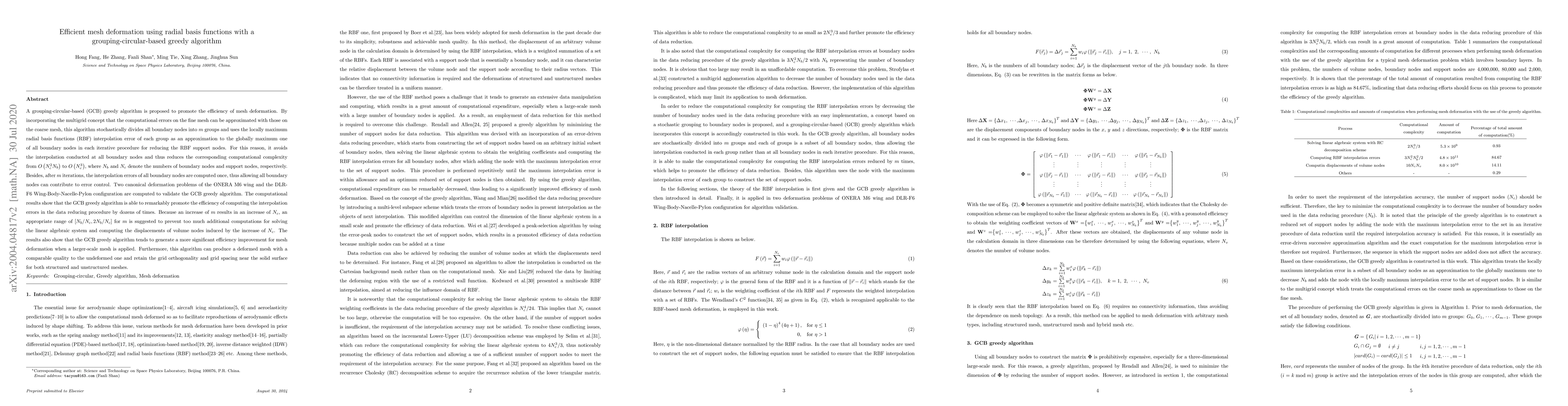 This paper proposes a grouping-circular-based (GCB) greedy algorithm to enhance mesh deformation efficiency using radial basis functions (RBF). The GCB algorithm reduces computational complexity by approximating errors on coarse meshes and iteratively minimizing RBF support nodes, achieving a complexity reduction from $O\left({N_c^2{N_b}} \right)$ to $O\left( {N_c^3} \right)$. Computational results demonstrate significant efficiency improvements for large-scale meshes.